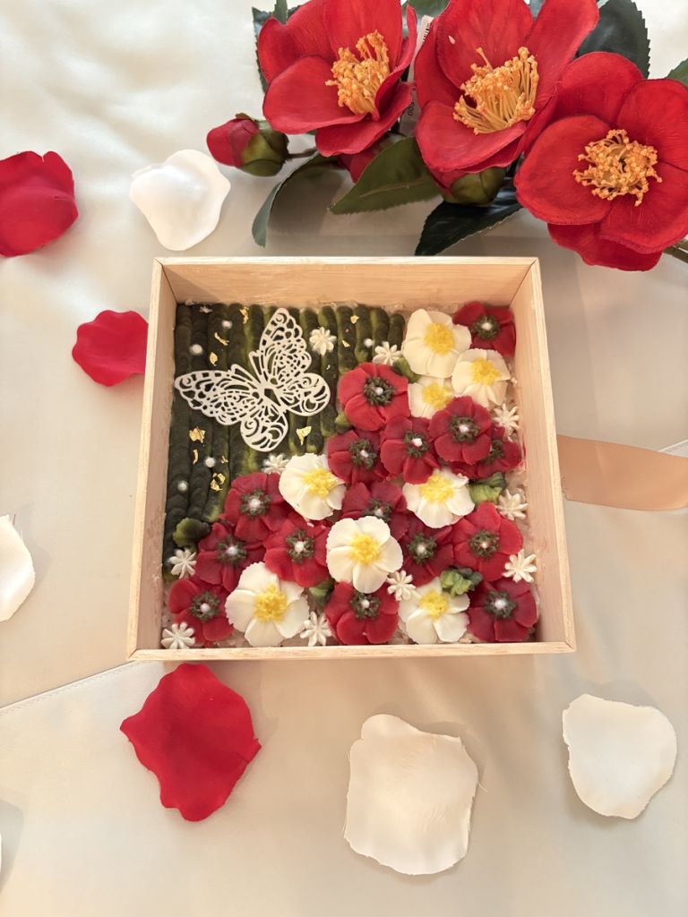 짜신 꽃은 박스에 깔아둔 오하기 위에 장식하고, 대나무 숲도 더해 마무리합니다.