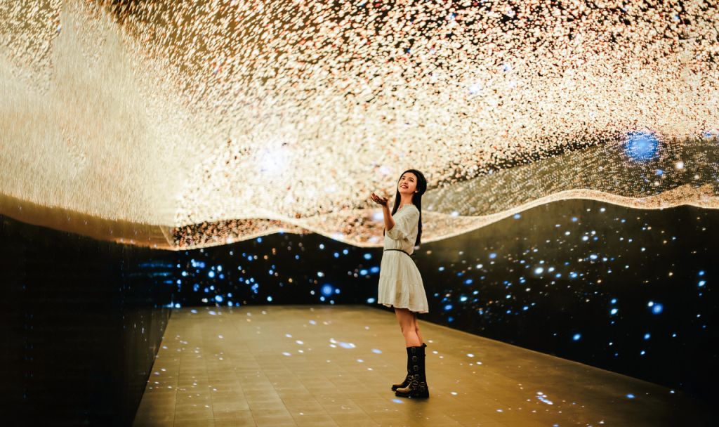 떠다니는 행성들에 둘러싸인 듯한 느낌을 주는 멋진 거울 방으로, 마법 같고 몰입감 넘치는 우주 같은 분위기를 자아냅니다.