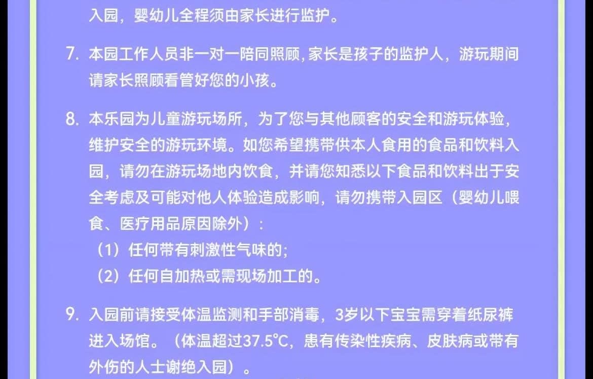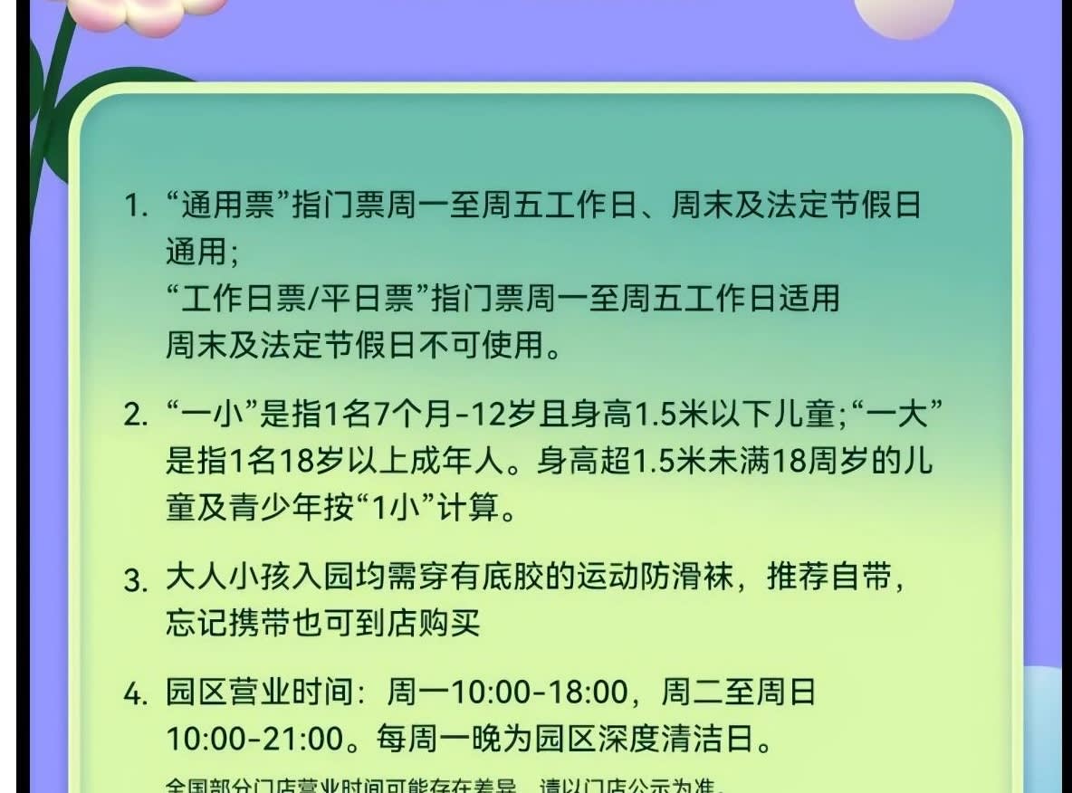 ▶성인 1인 & 아동 1인 일반 입장권 (¥200-¥50 상당의 식사 바우처 1매 포함) - 이용요건 * "성인 1인"은 만 18세 이상 성인 1명을 의미하며, 아동 티켓으로 성인 입장이 불가합니다. "아동 1인"은 신장 1.5미터 이하, 만 7개월~12세 아동 1명을 의미합니다. * 신장 1.5미터 초과 만 18세 미만의 아동 및 청소년은 아동 티켓을 구매하고 중요 공지 사항을 읽고 서명해야 하며, 공원 입장 시 반드시 보호자의 동반 및 감독이 필요합니다. - 추가정보 * 본 놀이공원은 7개월부터 만 12세 이하(12세 포함)이고 키 1.5m 이하의 어린이를 대상으로 운영되며, 어린이는 보호자와 동반 입장해야 합니다. (안전한 이용을 위해 임산부, 미성년자, 65세 이상 노인 및 기타 완전한 민사 행위 능력이 없는 분은 어린이의 보호자 또는 후견인으로서 입장할 수 없습니다.) * 성인 1명 추가 동반 시 동반 티켓을 구매해야 합니다(동반 티켓은 주 티켓과 동시에 사용해야 하며, 단독으로 사용할 수 없습니다. 가격은 현장 판매가를 기준으로 하며, 패키지에 포함된 경우는 제외됩니다). * 안전 및 위생을 위해 보호자 및 어린이는 미끄럼 방지 밑창이 있는 미끄럼 방지 양말을 착용해야 입장이 가능합니다. 고객님께서는 개인적으로 지참하시는 것을 권장하며, 미지참 시 매장 프런트에서 구매하실 수 있습니다(CNY 5/켤레). * 안전한 보호를 위해, 일단 파크에 입장하신 후에는 동반 보호자를 교체할 수 없습니다. 특별한 사유로 인해 아동의 보호자(또는 법적 보호자)를 교체해야 하는 경우, 교체 전후의 보호자가 함께 파크 프런트 데스크를 방문하여 등록하고 서명하여 확인해야 합니다. * 파크는 1회 입장 및 퇴장을 1회 완전한 이용으로 간주하며, 고객님의 사유로 퇴장 시 이용이 종료된 것으로 간주합니다. 재입장 시에는 티켓을 재구매하거나 카드를 다시 사용해야 합니다. 특별한 사정으로 인해 짧은 시간 동안 퇴장해야 하는 경우 파크 안내 데스크 직원에게 문의하여 상황을 설명하고 도움을 요청하십시오. * 특수 그룹 친화적: 7개월 이하의 영유아는 카드 소지 아동의 동반 파트너로서 무료로 입장할 수 있으며, 영유아는 항상 보호자의 감독 하에 있어야 합니다. * 본원 직원은 일대일로 동행하여 돌보지 않으며, 학부모는 자녀의 보호자이므로, 놀이 시간 동안 학부모님께서 자녀를 보살펴 주시기 바랍니다. * 본 테마파크는 어린이를 위한 놀이 공간으로, 고객님의 안전과 쾌적한 이용 환경을 위해 다음과 같은 사항을 안내해 드립니다. 개인적으로 섭취할 음식물이나 음료를 반입하는 경우, 놀이 공간 내에서는 섭취를 삼가 주시기 바랍니다. 또한 안전상의 문제와 타인에게 불편을 초래할 수 있는 아래 음식물 및 음료는 반입이 금지됩니다(영유아 이유식 및 의료용품은 제외). ① 자극적인 냄새가 나는 음식물, ② 자체 발열 또는 현장 조리가 필요한 음식물 * 입장 전 체온 측정 및 손 소독을 받아 주시기 바랍니다. 3세 미만 유아는 기저귀를 착용 후 입장 가능합니다. (체온이 37.5°C를 초과하거나 전염성 질환, 피부병 또는 외상이 있는 분은 입장이 불가합니다.)