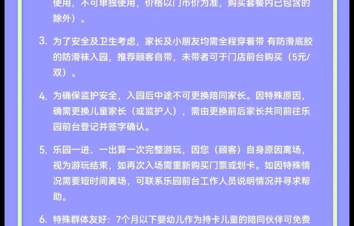 ▶성인 1인 동반 티켓 - 이용요건 * "성인 1인"은 만 18세 이상 성인 1명을 의미하며, 아동 티켓으로 성인 입장이 불가합니다. "아동 1인"은 신장 1.5미터 이하, 만 7개월~12세 아동 1명을 의미합니다. * 신장 1.5미터 초과 만 18세 미만의 아동 및 청소년은 아동 티켓을 구매하고 중요 공지 사항을 읽고 서명해야 하며, 공원 입장 시 반드시 보호자의 동반 및 감독이 필요합니다. - 추가정보 * 본 놀이공원은 7개월부터 만 12세 이하(12세 포함)이고 키 1.5m 이하의 어린이를 대상으로 운영되며, 어린이는 보호자와 동반 입장해야 합니다. (안전한 이용을 위해 임산부, 미성년자, 65세 이상 노인 및 기타 완전한 민사 행위 능력이 없는 분은 어린이의 보호자 또는 후견인으로서 입장할 수 없습니다.) * 성인 1명 추가 동반 시 동반 티켓을 구매해야 합니다(동반 티켓은 주 티켓과 동시에 사용해야 하며, 단독으로 사용할 수 없습니다. 가격은 현장 판매가를 기준으로 하며, 패키지에 포함된 경우는 제외됩니다). * 안전 및 위생을 위해 보호자 및 어린이는 미끄럼 방지 밑창이 있는 미끄럼 방지 양말을 착용해야 입장이 가능합니다. 고객님께서는 개인적으로 지참하시는 것을 권장하며, 미지참 시 매장 프런트에서 구매하실 수 있습니다(CNY 5/켤레). * 안전한 보호를 위해, 일단 파크에 입장하신 후에는 동반 보호자를 교체할 수 없습니다. 특별한 사유로 인해 아동의 보호자(또는 법적 보호자)를 교체해야 하는 경우, 교체 전후의 보호자가 함께 파크 프런트 데스크를 방문하여 등록하고 서명하여 확인해야 합니다. * 파크는 1회 입장 및 퇴장을 1회 완전한 이용으로 간주하며, 고객님의 사유로 퇴장 시 이용이 종료된 것으로 간주합니다. 재입장 시에는 티켓을 재구매하거나 카드를 다시 사용해야 합니다. 특별한 사정으로 인해 짧은 시간 동안 퇴장해야 하는 경우 파크 안내 데스크 직원에게 문의하여 상황을 설명하고 도움을 요청하십시오. * 특수 그룹 친화적: 7개월 이하의 영유아는 카드 소지 아동의 동반 파트너로서 무료로 입장할 수 있으며, 영유아는 항상 보호자의 감독 하에 있어야 합니다. * 본원 직원은 일대일로 동행하여 돌보지 않으며, 학부모는 자녀의 보호자이므로, 놀이 시간 동안 학부모님께서 자녀를 보살펴 주시기 바랍니다. * 본 테마파크는 어린이를 위한 놀이 공간으로, 고객님의 안전과 쾌적한 이용 환경을 위해 다음과 같은 사항을 안내해 드립니다. 개인적으로 섭취할 음식물이나 음료를 반입하는 경우, 놀이 공간 내에서는 섭취를 삼가 주시기 바랍니다. 또한 안전상의 문제와 타인에게 불편을 초래할 수 있는 아래 음식물 및 음료는 반입이 금지됩니다(영유아 이유식 및 의료용품은 제외). ① 자극적인 냄새가 나는 음식물, ② 자체 발열 또는 현장 조리가 필요한 음식물 * 입장 전 체온 측정 및 손 소독을 받아 주시기 바랍니다. 3세 미만 유아는 기저귀를 착용 후 입장 가능합니다. (체온이 37.5°C를 초과하거나 전염성 질환, 피부병 또는 외상이 있는 분은 입장이 불가합니다.)