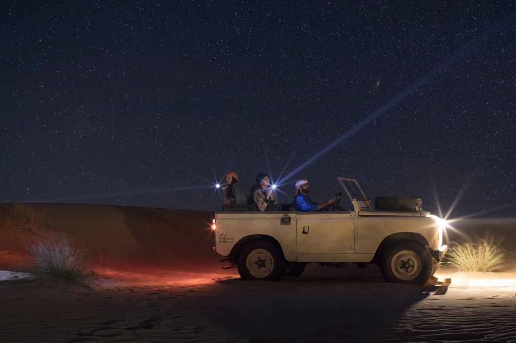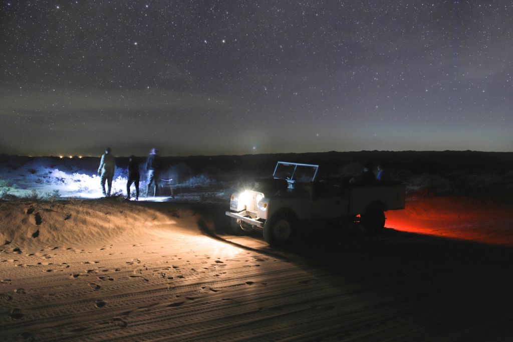 빈티지 랜드로버를 타고 사파리 모험을 즐기며 밤에는 사막의 고요함을 경험해 보세요.