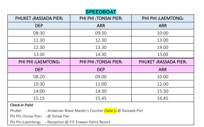 ▶ 운영시간 * 푸켓 (라사다 선착장) 출발편 08:30 푸켓(라사다)→09:30 피피(통사이)→10:00 피피(램통) - 11:30 푸켓(라사다)→12:30 피피(통사이)→13:00 피피(램통) - 12:30 푸켓(라사다)→13:30 피피(통사이)→14:00 피피(램통) - 13:30 푸켓(라사다)→14:30 피피(통사이)→15:00피피(램통) * 피피 (램통 선착장) 출발편 08:20 피피(램통)→09:00 피피(통사이)→10:00 푸켓(라사다) - 10:30 피피(램통)→11:00 피피(통사이)→12:00 푸켓(라사다) - 14:00 피피(램통)→14:30 피피(통사이)→15:30 푸켓(라사다) - 15:15 피피(램통)→15:45 피피(통사이)→16:45 푸켓(라사다) * 주의 사항 출발 30분 전에 꼭 도착해주셔야 합니다. * 체크인 장소 푸켓(라사다) : Rassada Pier 내 안다만 웨이브 마스터 카운터 (Gate1, 3번) - 피피(통사이): Tonsai Pier - 피피(램통): P.P. Erawan Palms Resort 리셉션