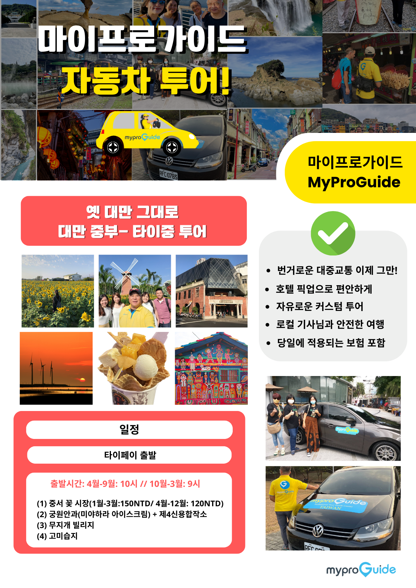 대만판 작은 네덜란드라고 불리우는 타이중 중서 화훼시장! 일년 내내 다양한 꽃이 만발한 유럽식 정원에서 마치 유럽에 온듯한 느낌을 받아보고, 60가지의 맛을 골라 먹을 수 있는 타이중에서도 특색있는 궁원안과(미야하라)에 들러서 달콤함을 맛보며, 알록달록한 기쁨 에너지가 뿜어져 나오는 타이중의 명소 무지개 마을에서 역사를 알아가 보세요! 마지막으로 타이중 석양으로 유명한 고미습지에서 저녁 노을을 감상합니다.
