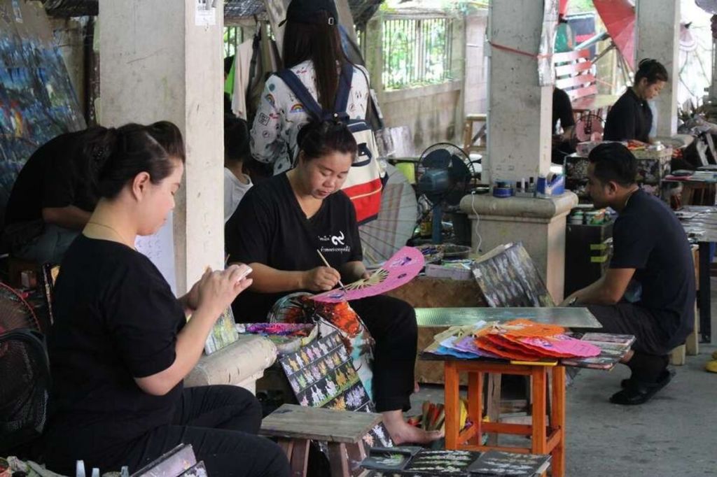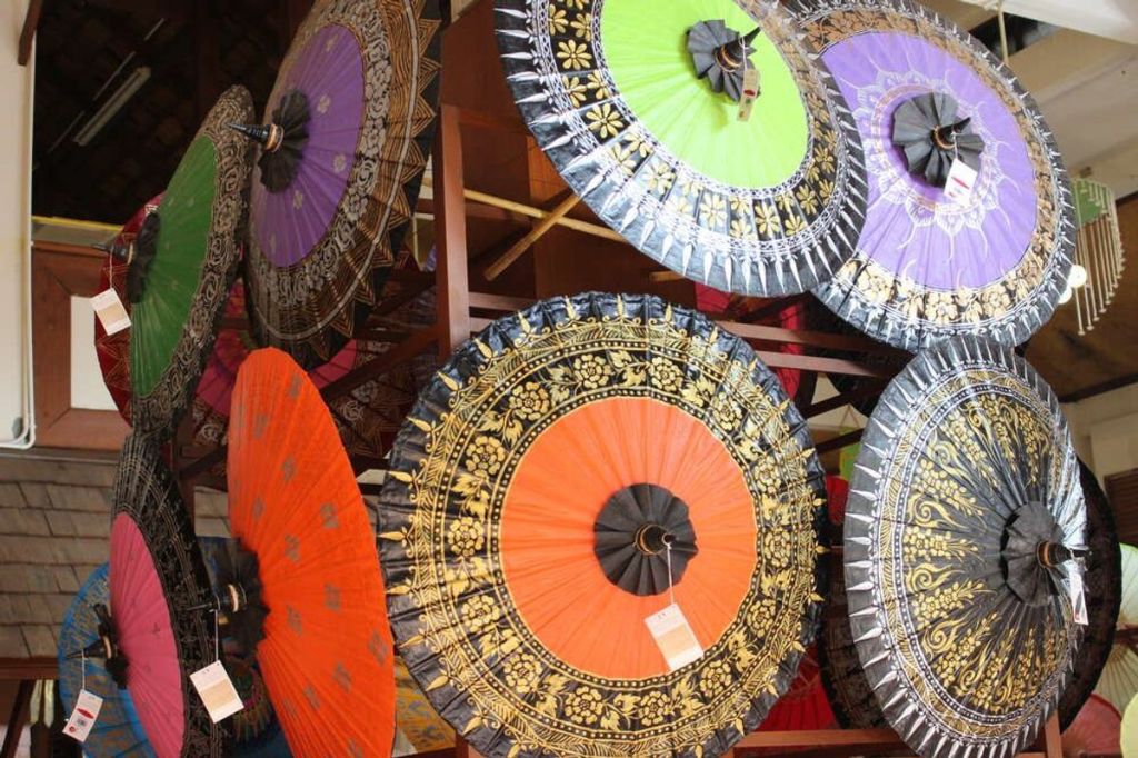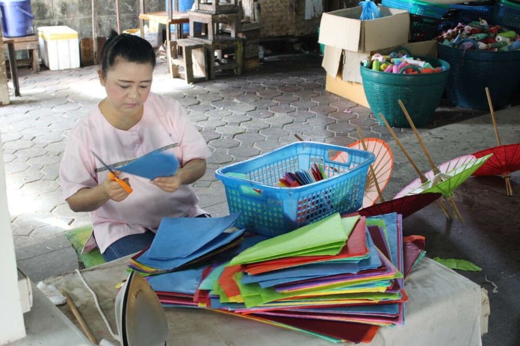버쌍 마을의 전통 공예인 종이공예와 우산 공예품 제작 과정을 감상합니다.