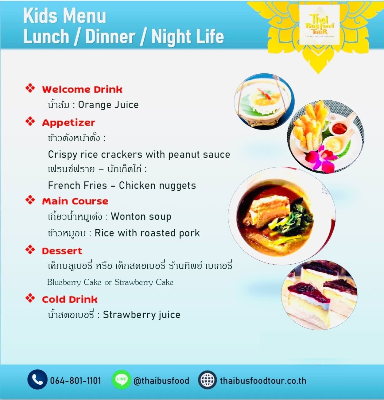 ▶ 주의사항 해당 서비스는 타이 버스 푸드 투어 회사 측 사정으로 서비스 내용이 예고없이 변경될 수 있어요. (운행시간이나 운행코스, 식사 종류 등) 성탄절, 송크란, 신년, 태국 휴일, 발렌타이 데이 등 특별요금이 부과가 돼요 - 🧳짐 보관 안내 개인 짐이 있을 경우 사무실에서 별도 보관해드립니다. 귀중품은 직접 휴대하시기를 권장 드립니다. - 🔸아동 메뉴 안내 웰컴 드링크 [오렌지 주스] 애피타이저 [땅콩 소스를 곁들인 바삭한 쌀과자, 프렌치 후라이] 메인 [완탄수프, 돼지고기 덮밥] 디저트 [블루베리 케이크 또는 딸기 케이크] 음료[딸기주스] ▶ 아동 정책 만 3세 이하의 유아는 무료이며, 따로 좌석은 제공되지 않습니다. 8세 이하의 아동은 아동 메뉴가 제공됩니다.