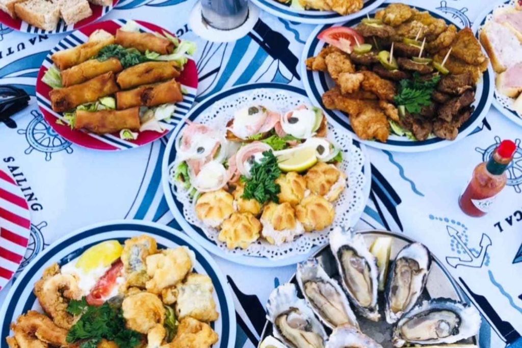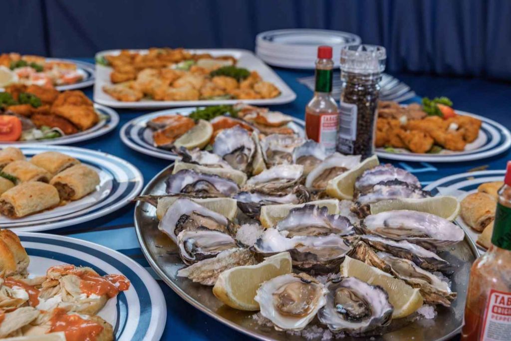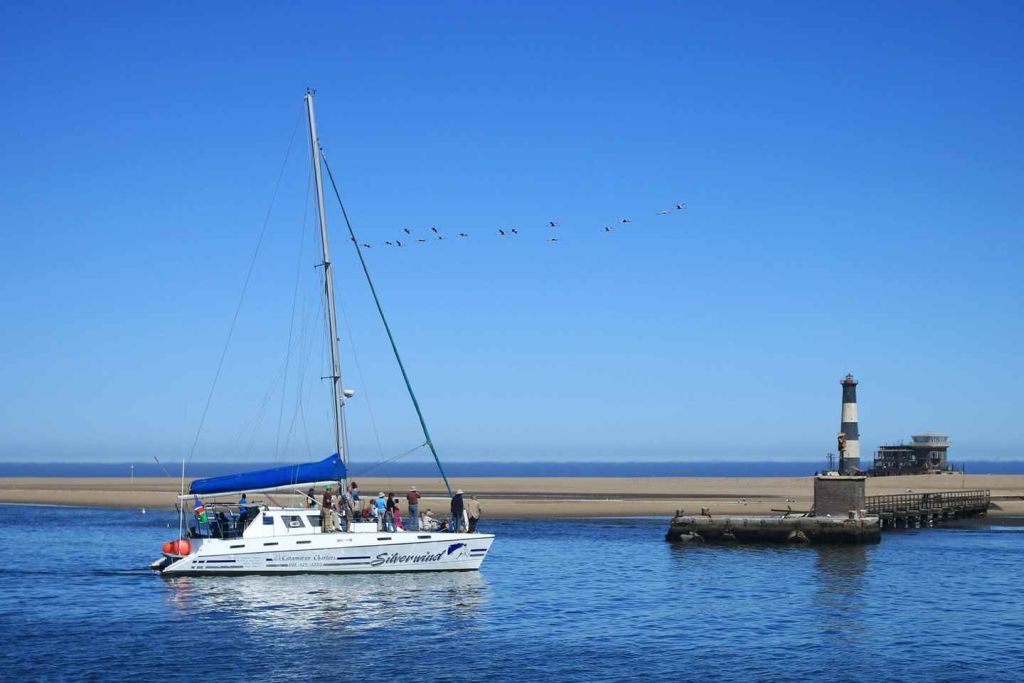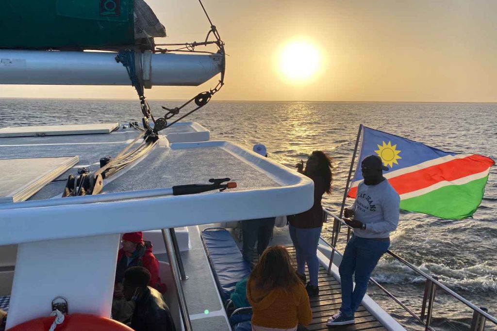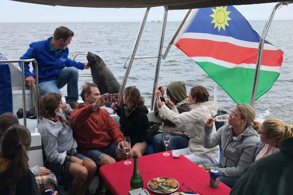 펠리컨 포인트에서 더 큰 베이 지역을 통과하는 여정에서 우리는 베이를 방문하는 더 흥미로운 선박과 석유 굴착 장치를 지나갑니다. 점심 식사를 제공합니다. 게스트는 세계적 수준의 신선한 나미비아산 굴과 상큼한 스파클링 와인, 다양한 맛있는 간식과 디저트 페이스트리를 즐길 수 있습니다. 또한, 시원한 나미비아 맥주와 청량 음료도 제공합니다.