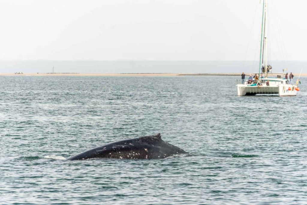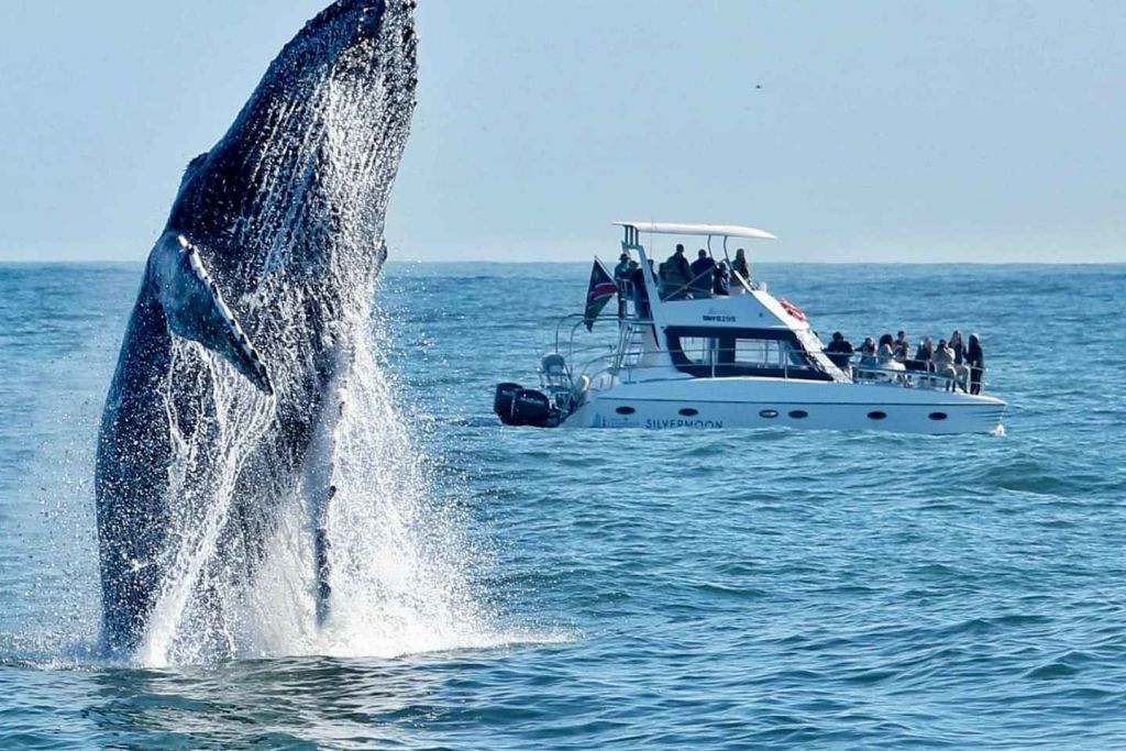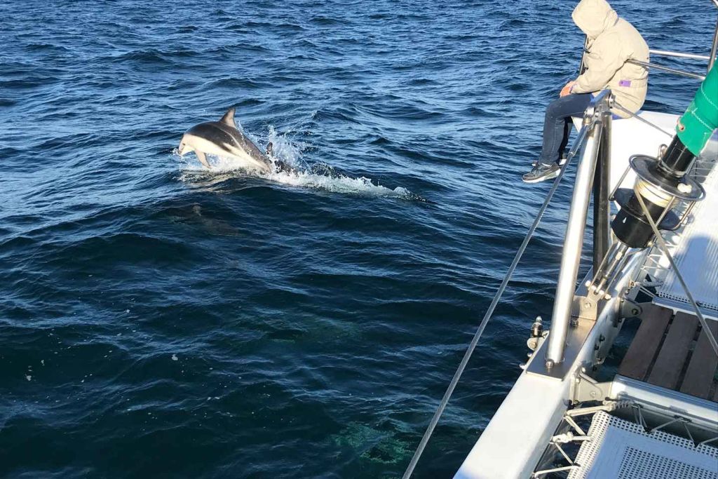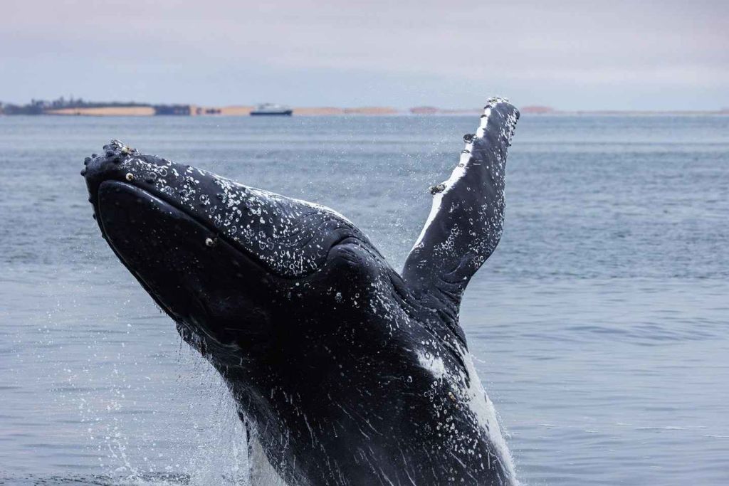 이 지점을 지나 탁 트인 바다로 향합니다. 7월부터 11월 사이에는 남방긴수염고래와 혹등고래 같은 대형 포유류를 종종 볼 수 있으며, 회색고래와 피그미고래 같은 다른 고래 종도 종종 모습을 드러냅니다.