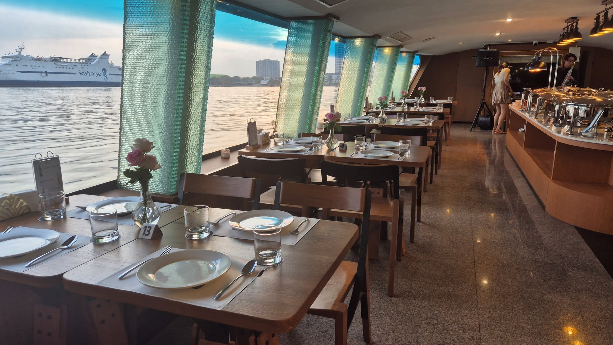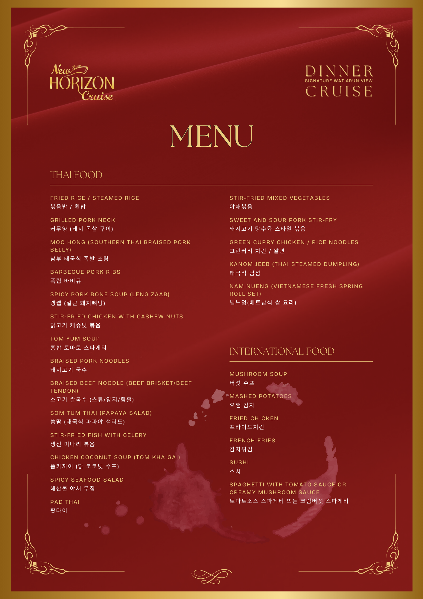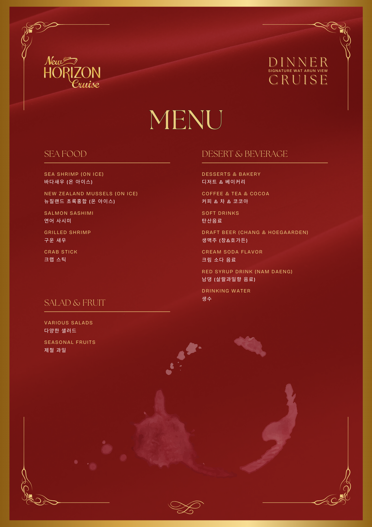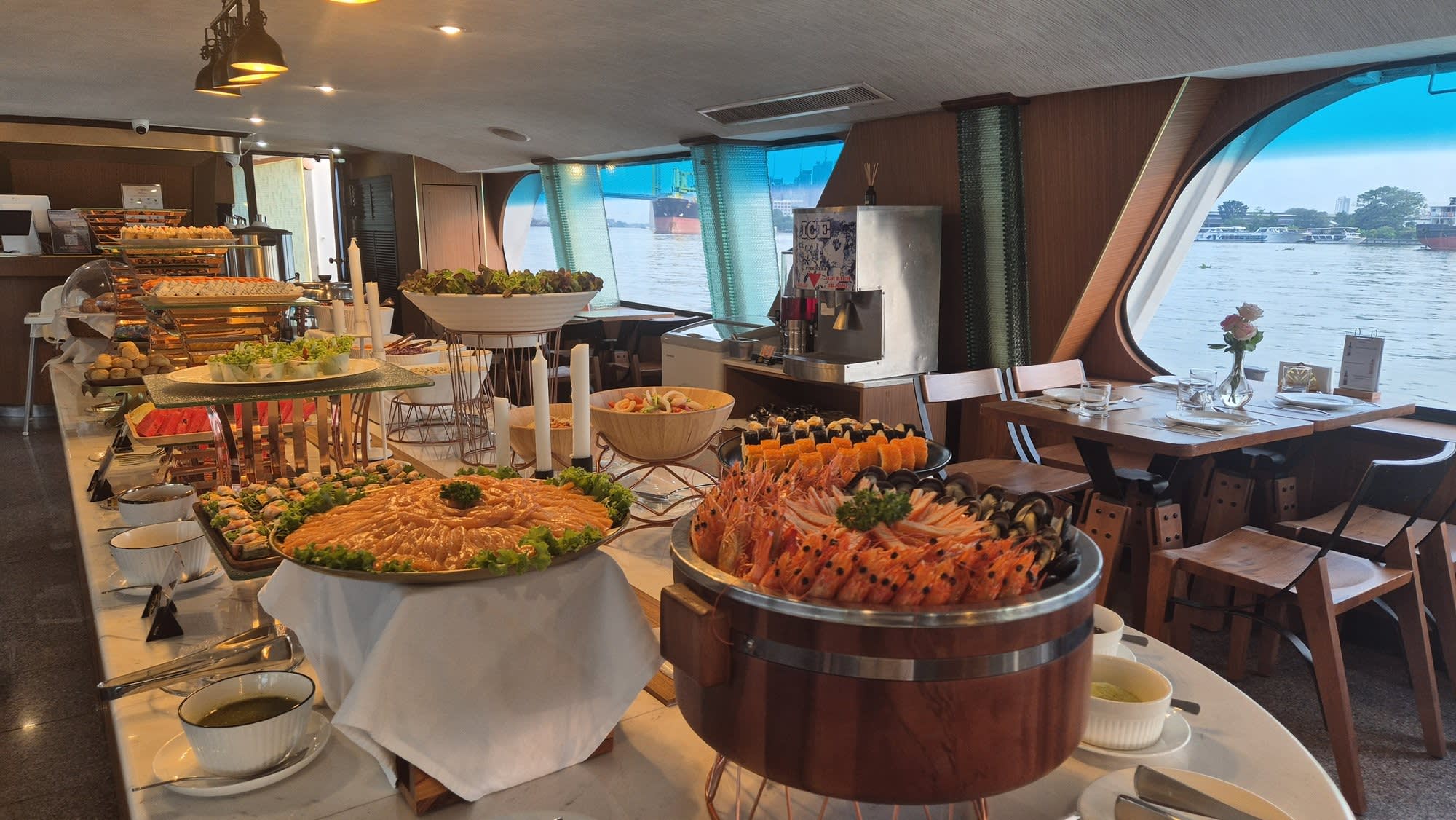 왓아룬 앞을 천천히 지나며 여유롭게 사진을 찍을 수 있는 특별한 크루즈로, 신선한 해산물과 30여 가지의 인터내셔널 뷔페를 즐기며 감미로운 라이브 공연까지 함께할 수 있습니다. 대형 크루즈보다 규모가 작아 혼잡하지 않고, 아늑하고 로맨틱한 분위기 속에서 방콕의 밤을 만끽할 수 있는 최고의 선택입니다.