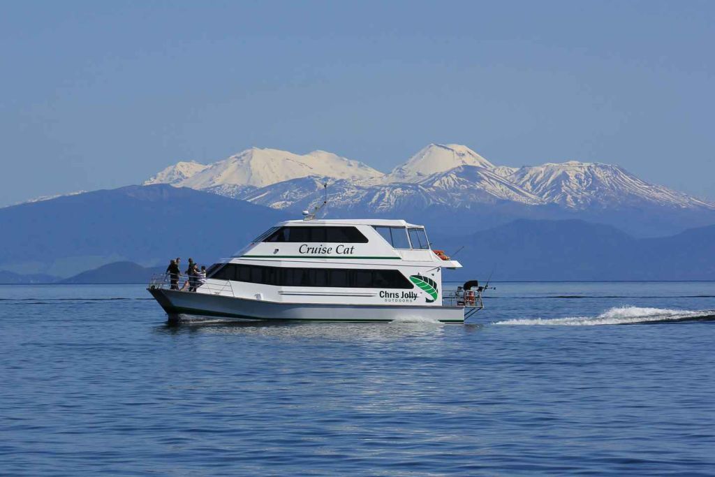 물 위에서 타우포 호수 주변의 절경을 감상하세요.