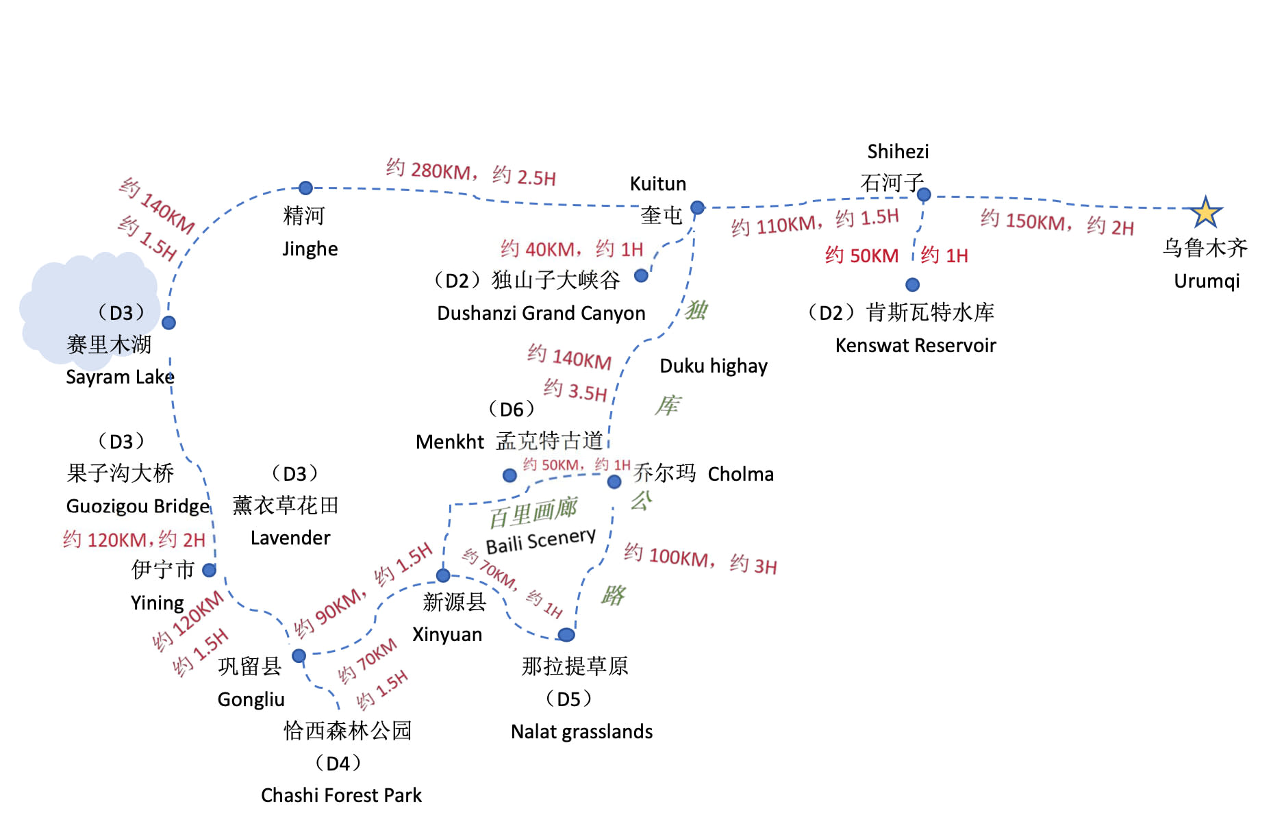 • # 노선도: 우루무치 출발 및 도착