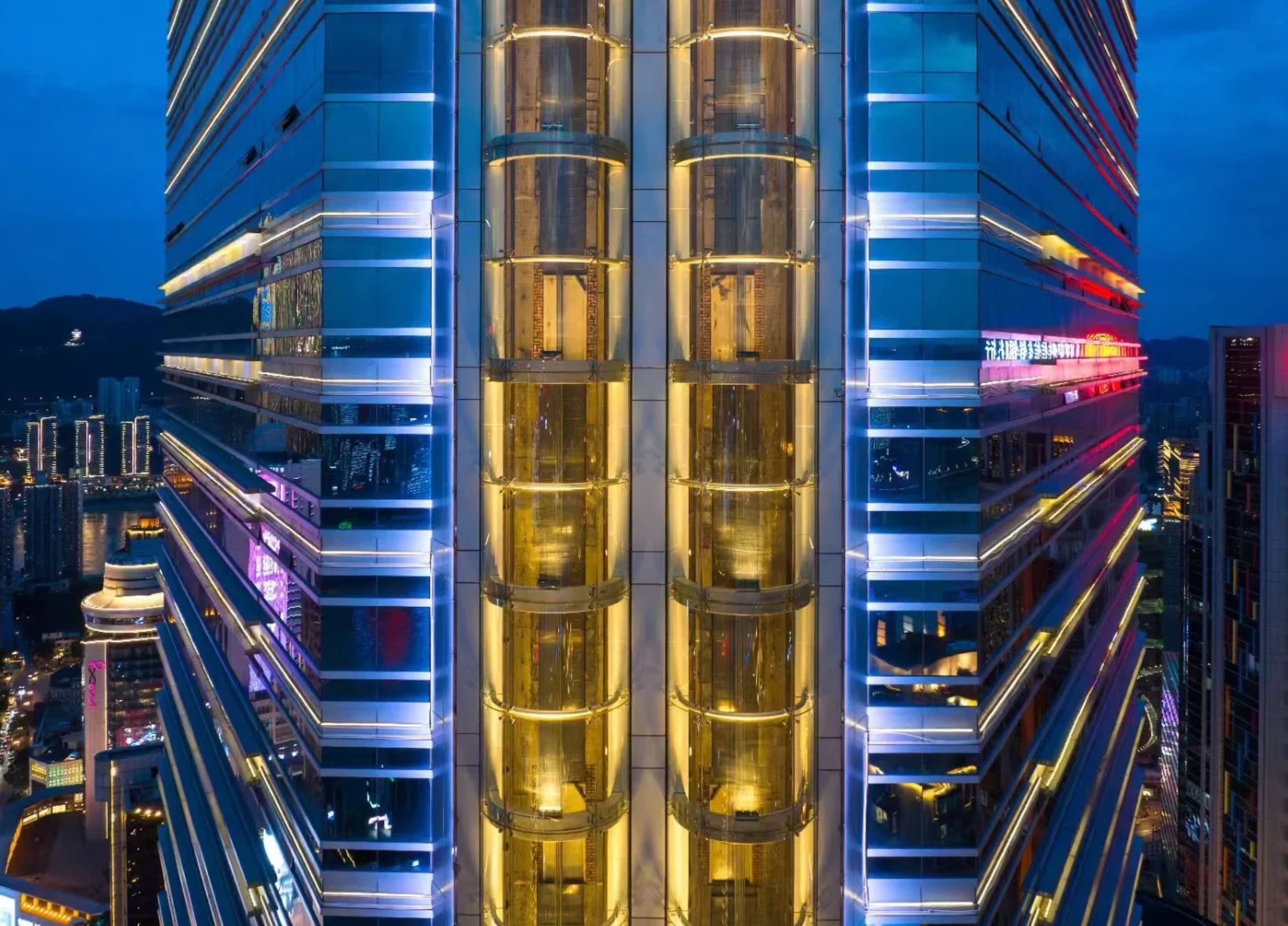 * 이 고공 여행을 시작하고 싶다면 엘리베이터에 발을 딛는 순간부터 "구름 속 셔틀" 체험이 시작됩니다. 총 높이 211.9m의 아시아 최장 오피스 빌딩 외부 관광 엘리베이터를 타고 단 85초 만에 지상에서 56층까지 바로 올라갈 수 있습니다. 엘리베이터 전체가 파노라마 유리로 디자인되어 있어 상승하는 동안 발밑의 해방비 상업지구가 축소 모형처럼 서서히 펼쳐지고, 장강과 가릉강은 도시를 휘감는 두 줄기의 금빛 띠로 변모합니다. "수직으로 도시 스카이라인을 가로지르는" 압도적인 느낌이 밀려오며, 처음 방문하는 사람들은 숨을 죽이며 감탄합니다. 이 상승 과정 자체가 현실에서 SF 영화의 기묘한 장면으로 뛰어드는 듯한 몰입형 시각적 향연입니다.