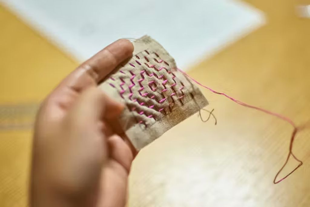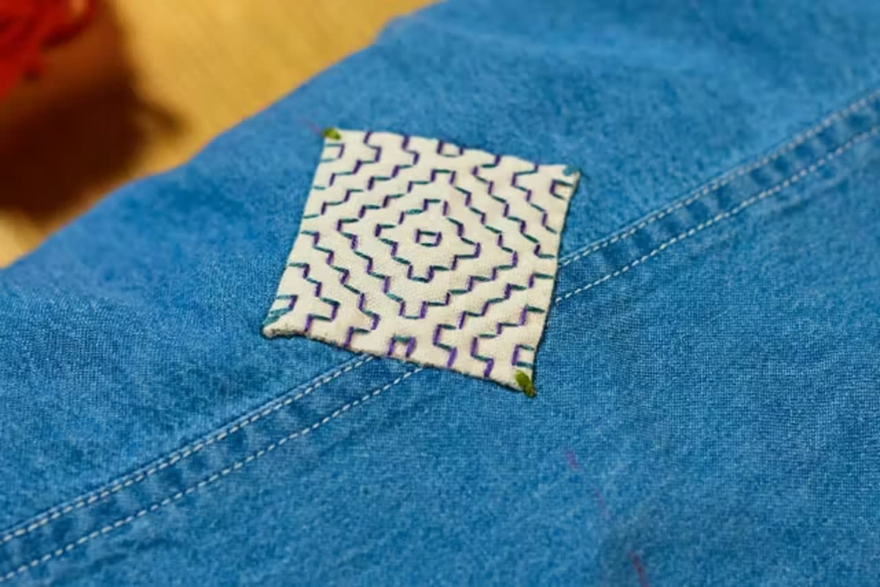 안도 목코 사시 자수 기법 중 하나인 몬 사시 기법을 사용하여 '등 부적'이라는 전통 일본 부적을 만들게 됩니다. '등 부적'은 아이들의 건강한 성장과 등을 통해 들어오는 악귀를 막기 위해 아이들 옷에 수놓는 자수 부적입니다.