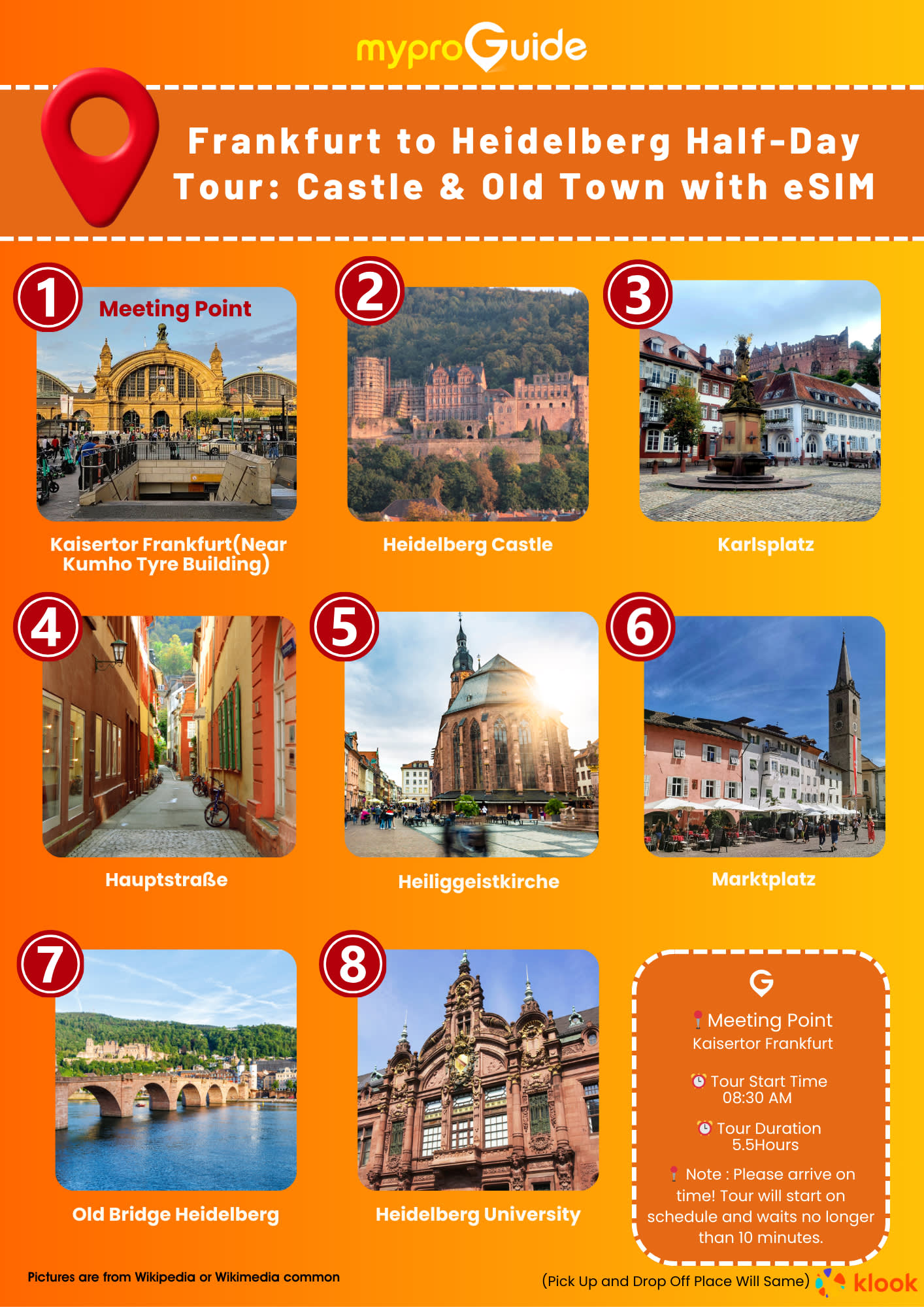 프랑크푸르트-하이델베르크의 매혹적인 투어에 참여하여 세계적으로 유명한 하이델베르크 성을 탐험하고, 매력적인 구시가지를 거닐며, 유서 깊은 하이델베르크 대학교를 방문하세요. 유럽에서 가장 오래된 쇼핑 거리 중 하나인 하우프트슈트라세(Hauptstraße)를 따라 여유롭게 걷고, 상징적인 옛 다리를 건너 네카어강의 숨 막히는 경치를 감상하세요. 특별 보너스로, 여행 내내 연결 상태를 유지할 수 있는 무료 eSIM을 받으세요! 왕복 교통편이 포함된 역사, 건축, 그리고 아름다운 경치의 완벽한 조화를 즐기세요. 전체 투어는 대중교통만 이용합니다.