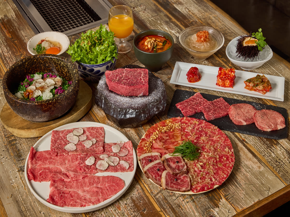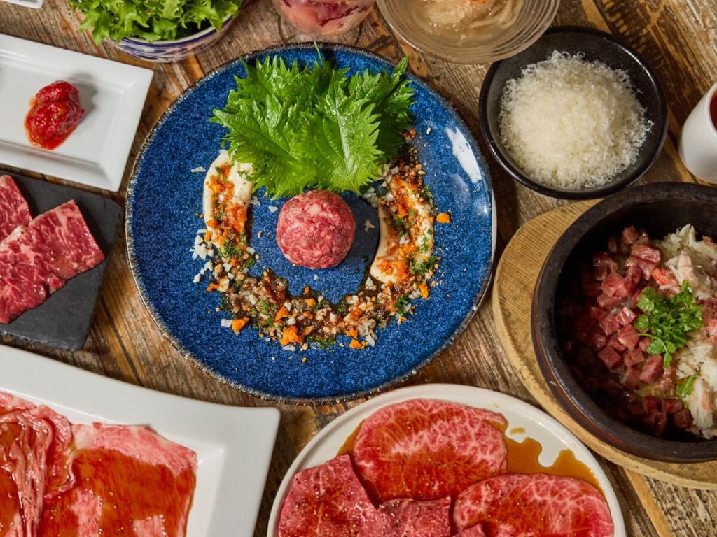 고기는 후생노동성으로부터 인가를 받은 '안심·안전'의 와규육회와 와규스시를 시작으로 30일간 숙성을 한 숙성 KINTA와 인기 브랜드 소의 센다이소와 미야자키소를 메인으로 취급하는 브랜드 소의 특징에 맞추어 커트해 제공하고 있습니다!