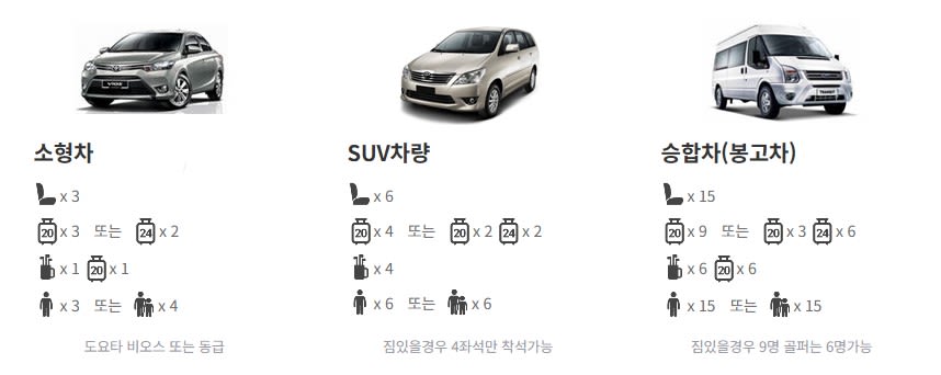 차량은 시간당 승용차 & SUV 10만동 (1팀당), 승합차 20만동 (1팀당)을 직접 주시면 됩니다.