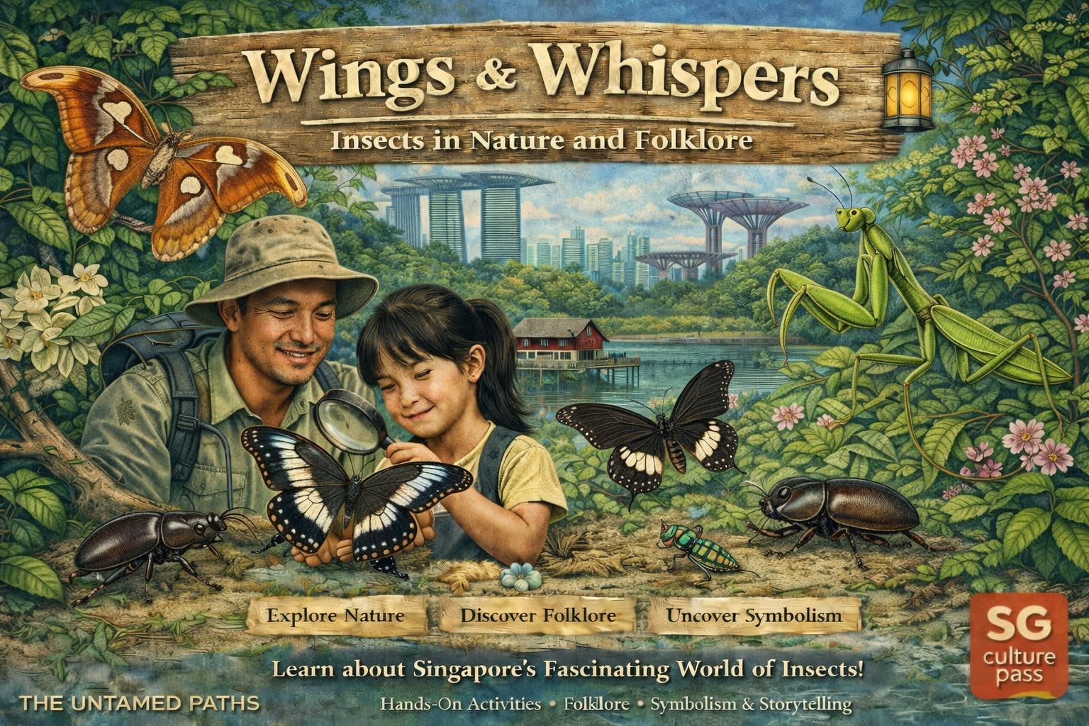 이 프로그램은 싱가포르의 문화, 역사, 생태계 속 곤충을 탐구합니다. 참가자들은 기록 보관소의 일화와 사진을 통해 민속과 캄퐁 생활 속 곤충에 대해 배웁니다. 나비, 딱정벌레, 매미, 잠자리와 같은 표본을 확대경으로 관찰하며 독특한 특징을 살펴봅니다. 가이드와 함께하는 스케치 세션에서는 자연주의 삽화와 초기 과학자들이 지역 곤충을 기록한 방법을 소개합니다. 프로그램은 문화 이야기, 생태학적 역할, 해충 방제, 보존 및 감상 사이의 균형에 대한 그룹 토론으로 마무리됩니다. 참가자들은 스케치를 기념품으로 간직할 수 있습니다.