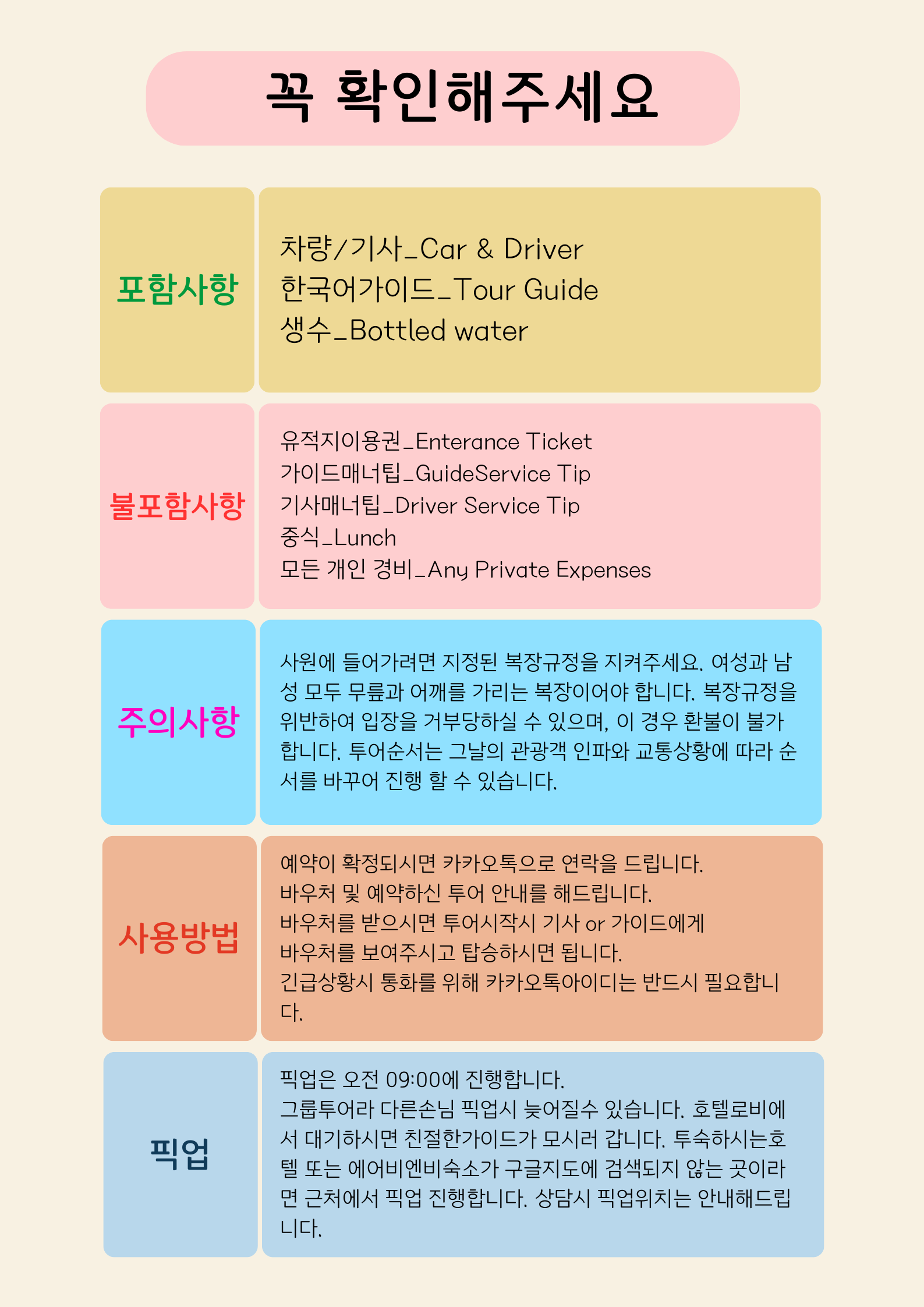 이 투어는 한국어로 진행되는 한국어가이드 투어입니다. 한국에서 오신 다양한 여행자들과 함께 하는 그룹투어입니다. 예약 확정된 후 발권되는 영어 및 한글로로 된 바우처를 모바일에 저장 또는 프린트 하신 후 지참 하신 후 투어에 참가해주셔야 합니다. 현지 교통 상황에 따라 투어순서는 변경될수있습니다 사원에 들어가려면 지정된 복장규정을 지켜주세요. 여성과 남성 모두 무릎과 어깨를 가리는 복장이어야 합니다. 복장규정을 위반하여 입장을 거부당하실 수 있으며, 이 경우 환불이 불가합니다. 투어순서는 그날의 관광객 인파와 교통상황에 따라 순서를 바꾸어 진행 할 수 있습니다.