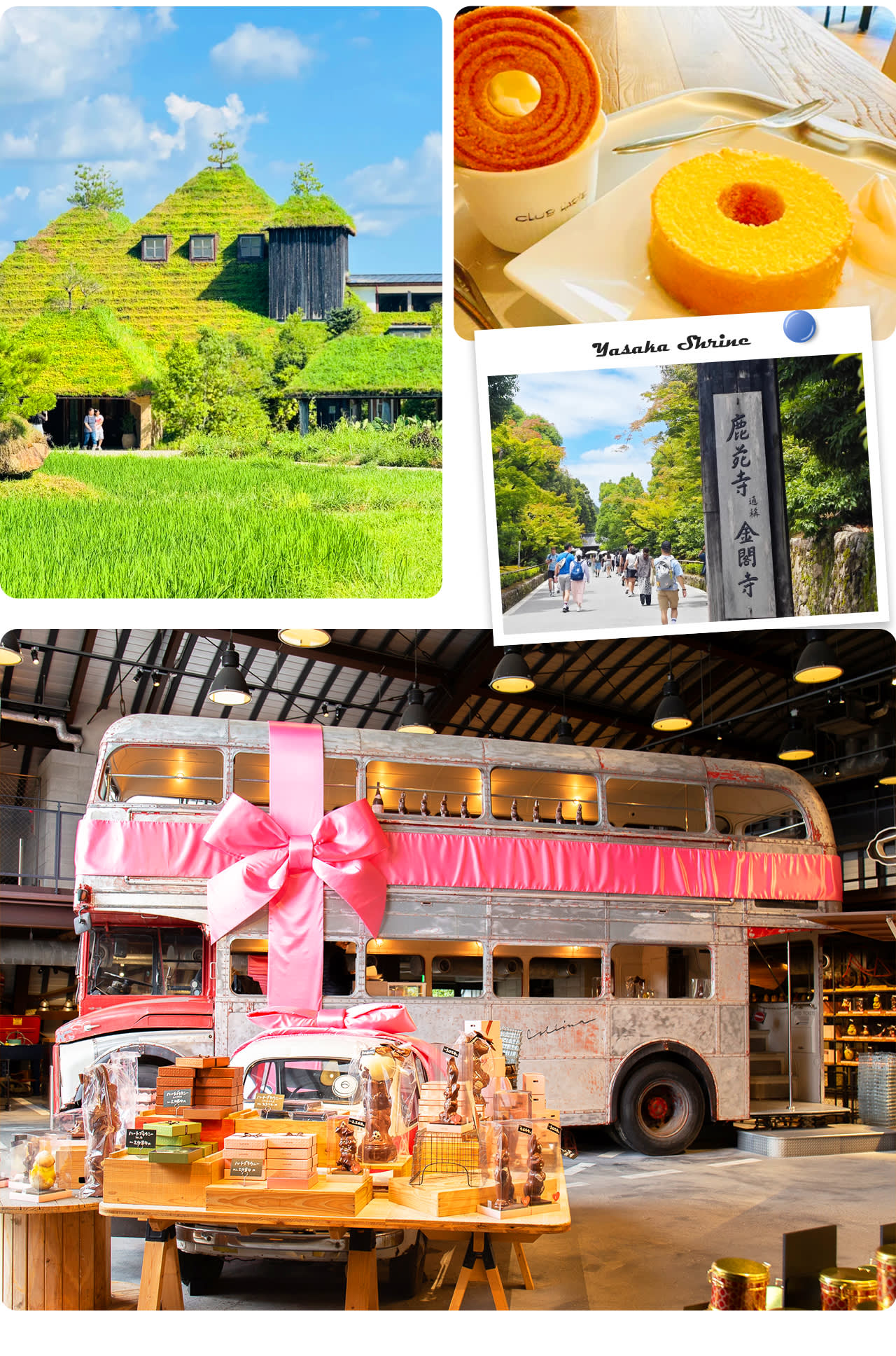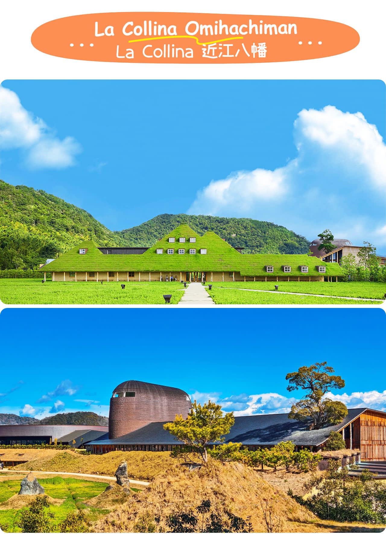 * La Collina 오미하치만: 건축 장난꾸러기 후지모리 테루노부가 만든 동화 속 디저트 왕국, 초가지붕이 자연과 어우러져 있으며, 매우 향긋한 갓 구운 바움쿠헨 등 한정된 맛있는 음식이 있음