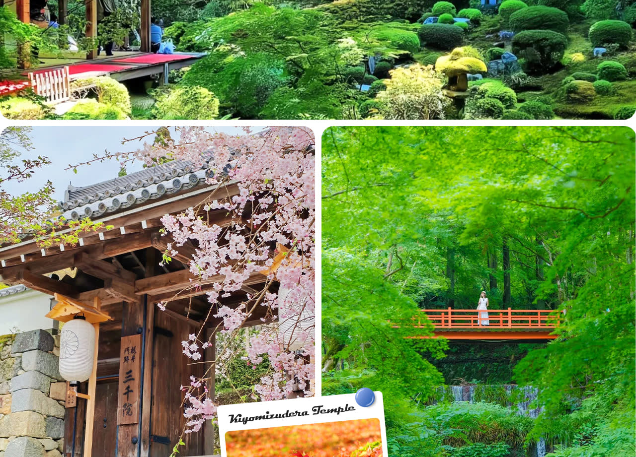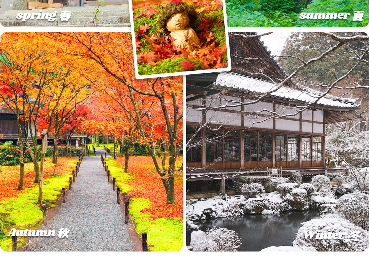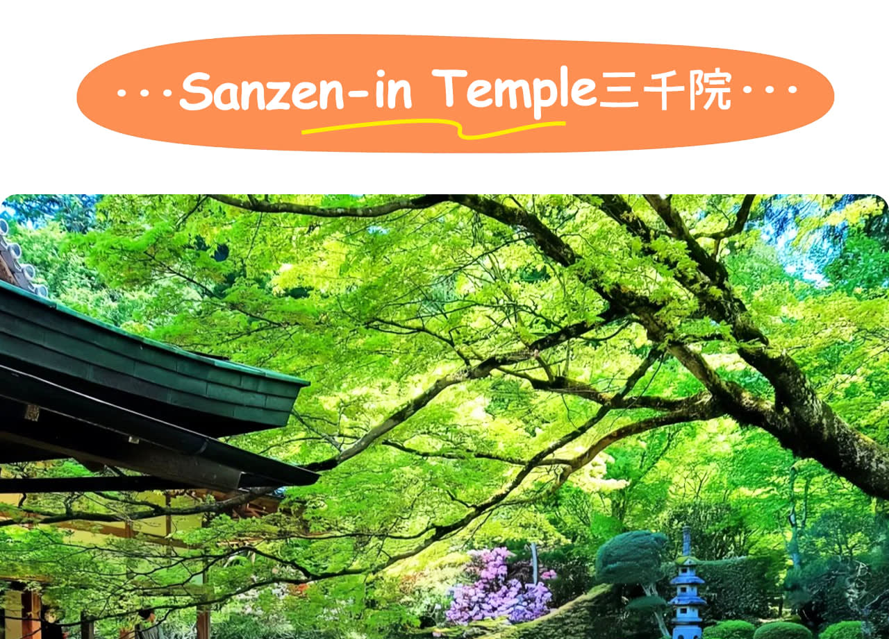 * 산젠인(계절 한정): 교토 오하라의 숨겨진 고찰, 8세기에 창건, 봄 벚꽃, 여름 숲, 가을 단풍, 겨울 설경, 사계절의 아름다운 선의의 경치가 마음을 평온하게 해줌