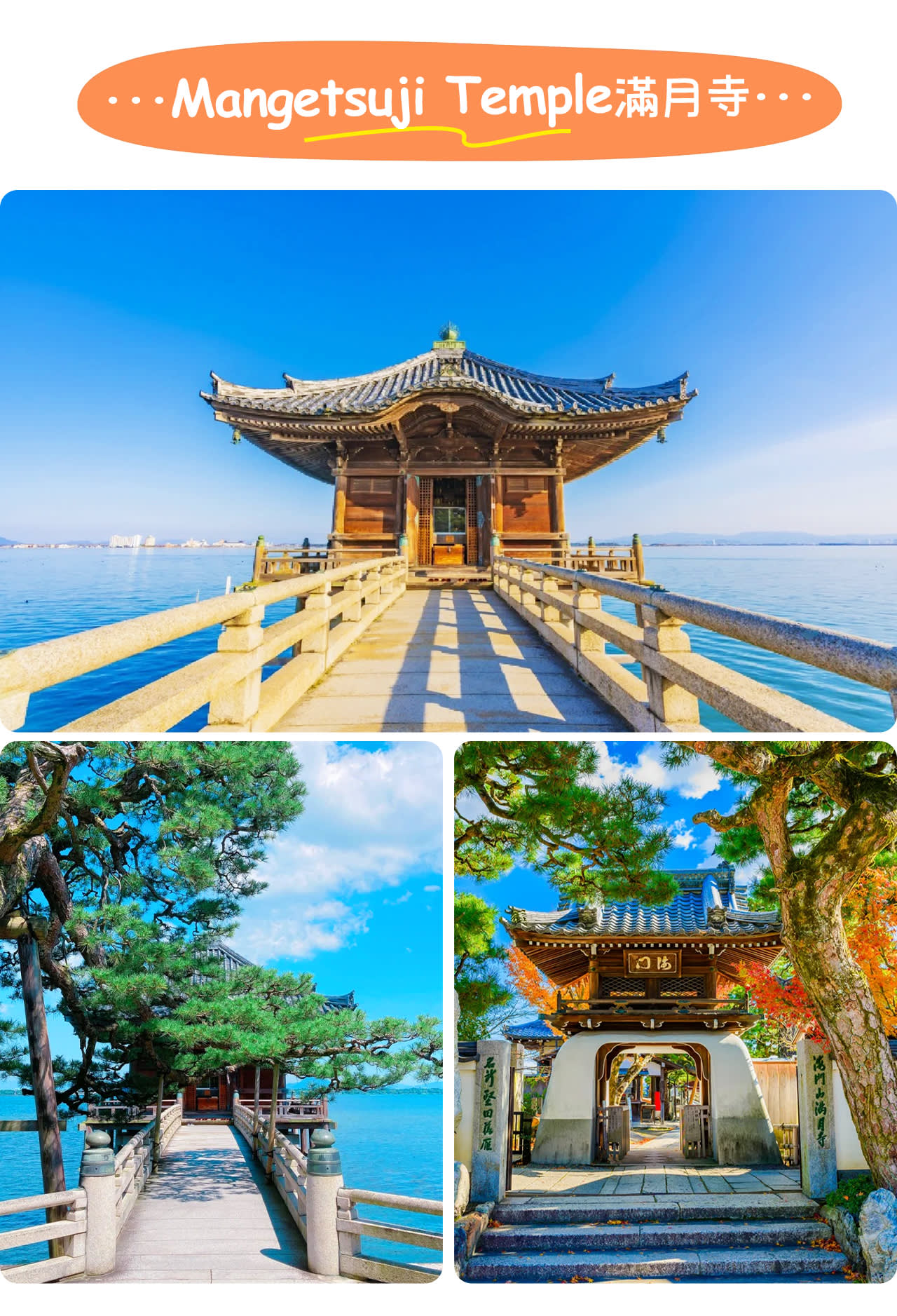 * 만게츠지 우키미도: 비와호에 떠 있는 불당, 임제종 사찰, 오미팔경 "가타다 낙안"으로 유명하며, 해돋이 때의 경치는 압권임