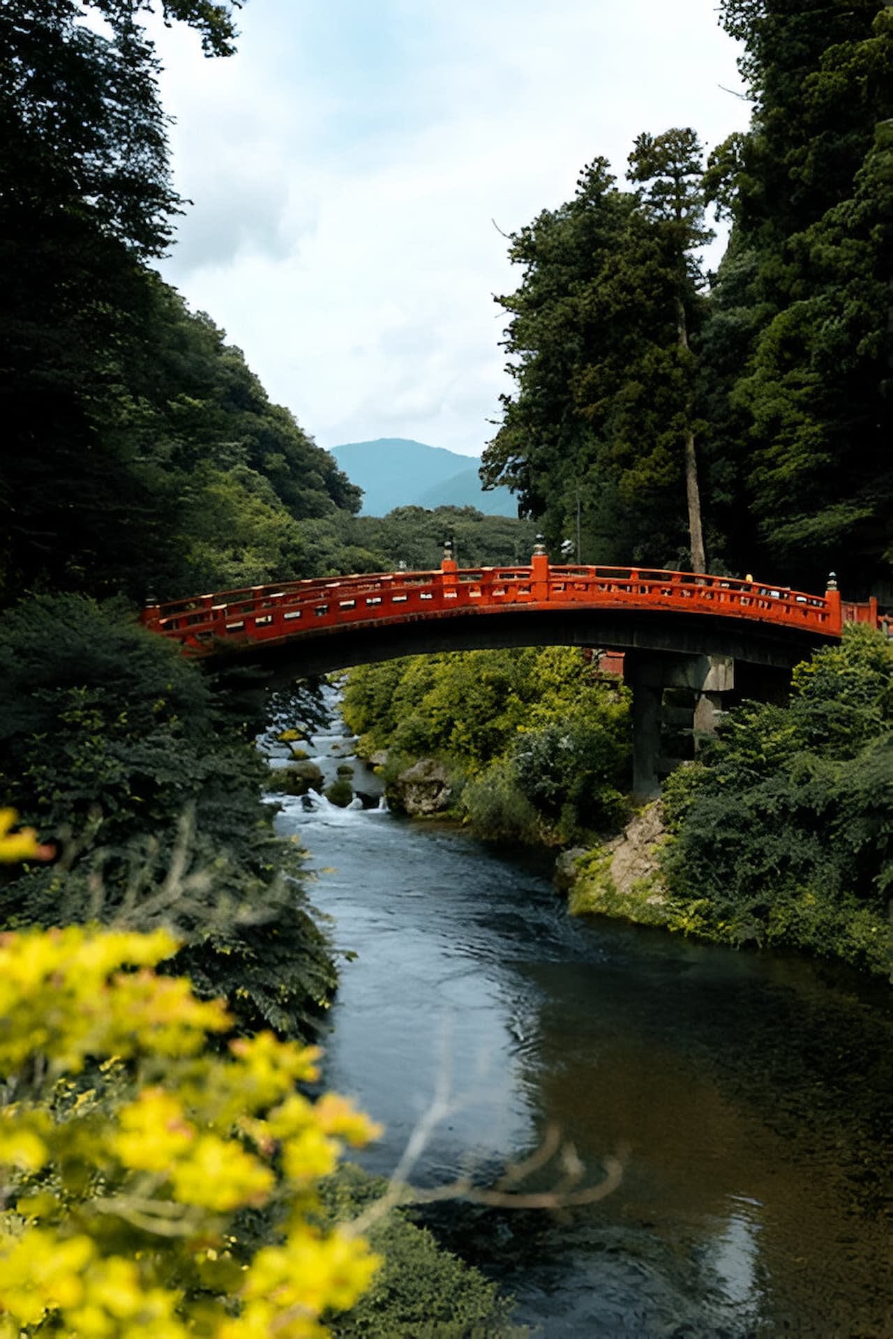* 닛코 신사 지역의 신성한 입구를 상징하는 다이야 강 위의 붉은색 칠을 한 상징적인 신쿄 다리 (붉은 다리)