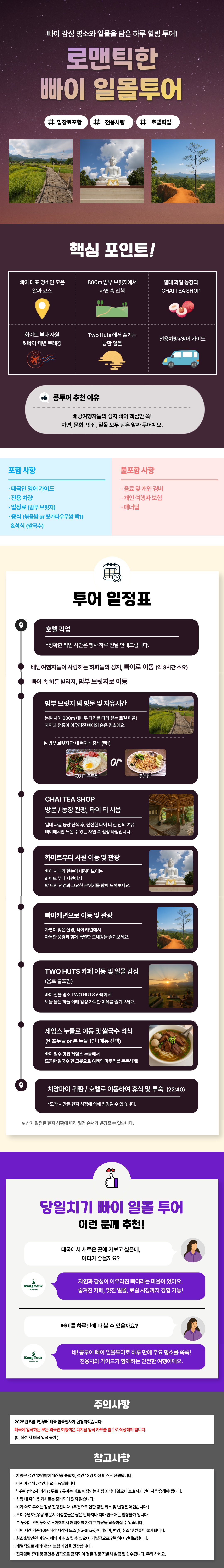 800m 대나무 다리 ‘밤부 브릿지’와 열대과일 농장이 있는 카페 CHAI TEA SHOP, 빠이의 상징 ‘화이트 부다 사원’, 자연 절경이 펼쳐지는 ‘빠이 캐년’을 둘러봅니다. 마지막으로 ‘Two Huts 카페’에서 감동적인 일몰을 감상하며 낭만적인 하루를 완성하세요.