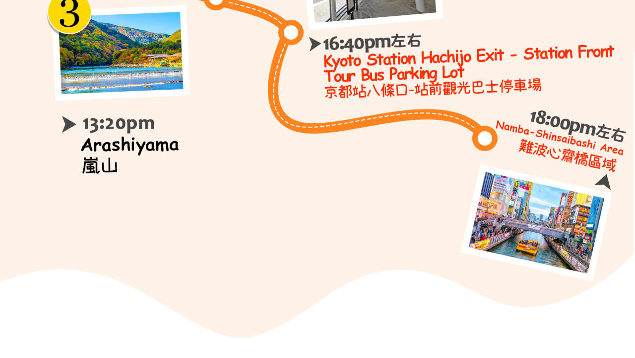 🌿 아라시야마 지역 아라시야마는 관광 구역이 넓으므로, 가이드가 각 관광 명소의 위치를 안내해 드립니다. 손님께서는 자유롭게 관광하실 수 있습니다. 사가노 로맨틱 열차를 탑승하시려는 손님께는 가이드가 동행하여 티켓 구매를 도와드립니다. 추천 탑승 시간: 사가노 11호 14:05-14:25 (사가→가메오카); 사가노 12호 14:30-14:56 (가메오카→사가). 비수기에는 가이드가 현장에서 티켓 구매를 도와드릴 수 있으며, 성수기에는 매진될 수 있으므로 최소 1개월 전에 공식 웹사이트에서 티켓을 구매하시는 것을 권장합니다.