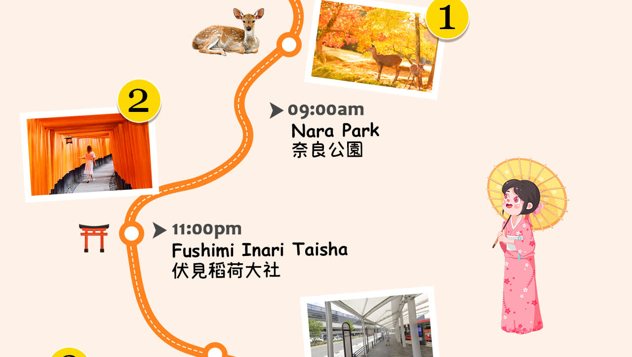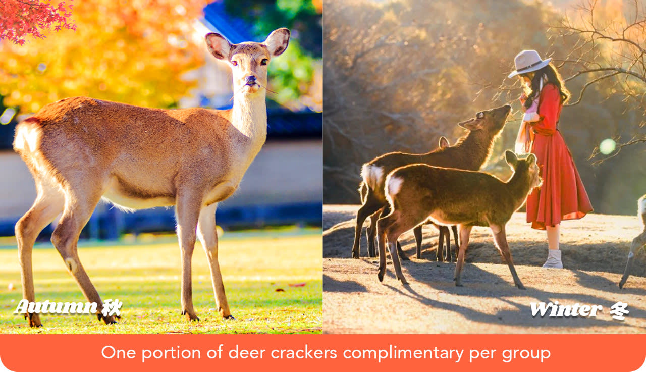 * 나라 공원에서 귀여운 사슴과 아름다운 단풍을 만나며 가을날 고도의 매력을 느껴보세요.