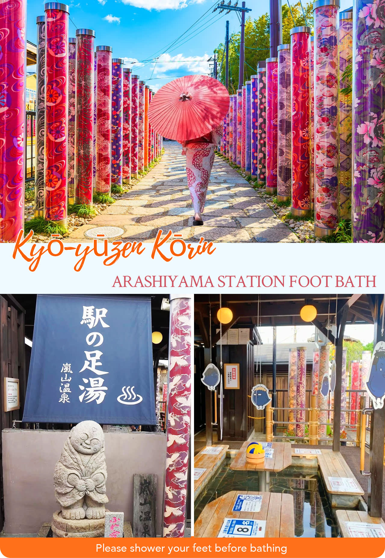 ♨️ 아라시야마 역의 족욕 온천은 피로를 풀기에 더할 나위 없이 좋은 곳입니다. 온천에 몸을 담그고, 달콤한 디저트를 맛보면 피로가 싹 가십니다! 역내의 유젠 키모노 숲은 환상적인 빛과 그림자의 세계를 만들어, 그 속을 거닐면 마치 꿈결같은 일본 분위기의 나라에 있는 듯한 느낌을 줍니다.