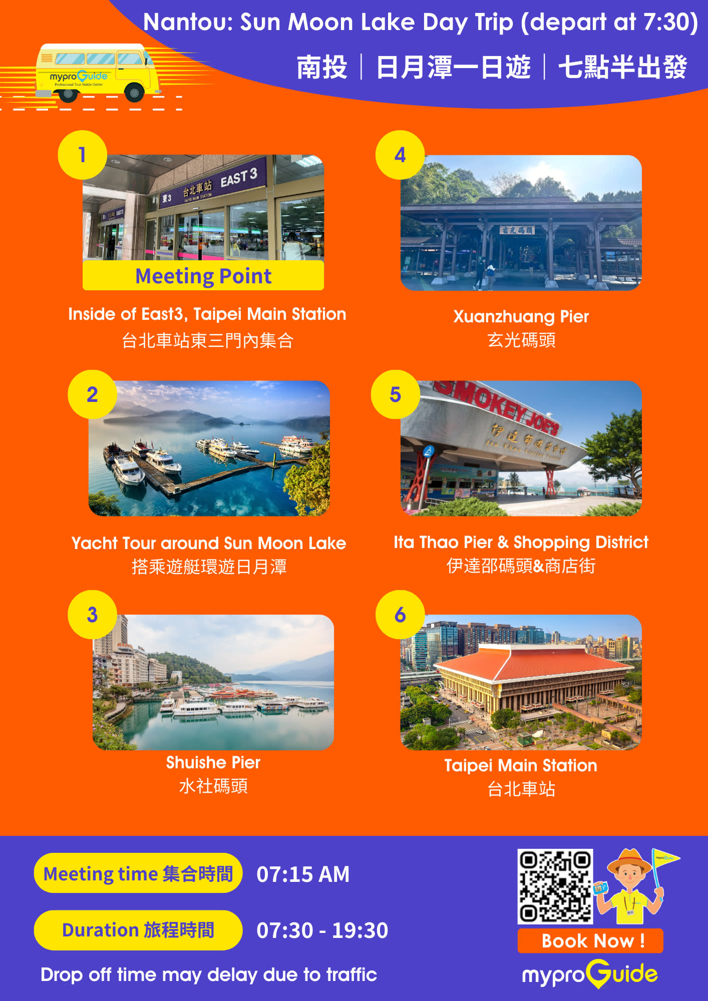 ▶【프라이빗 투어】 07:30 출발 - 이용요건 * 공지: 영유아 및 아동도 탑승객 인원수에 포함되어야 합니다. - 추가정보 * 대만 법규에 따라 만 4세 미만의 어린이는 아동용 카시트를 사용해야 합니다. 아동용 카시트가 필요하신 경우 미리 알려주시면 준비해 드립니다. * 프라이빗 단체 이동 서비스는 타이베이시(양명산 제외) 및 신베이시(三重區, 蘆洲區, 板橋區, 新莊區) 등 타이베이 광역 지역을 커버합니다. 타이베이 외 지역은 TWD1,000의 추가 요금이 부과되며, 타오위안 지역(공항 근처)으로 이동하는 경우 TWD2,000의 추가 요금이 부과됩니다. * 여행자 보험 가입을 위해 "특별 요청 사항"란에 모든 탑승객의 이름, 생년월일, 여권 번호를 기재해 주시기 바랍니다. 해당 정보가 없을 시 여행이 불가합니다.