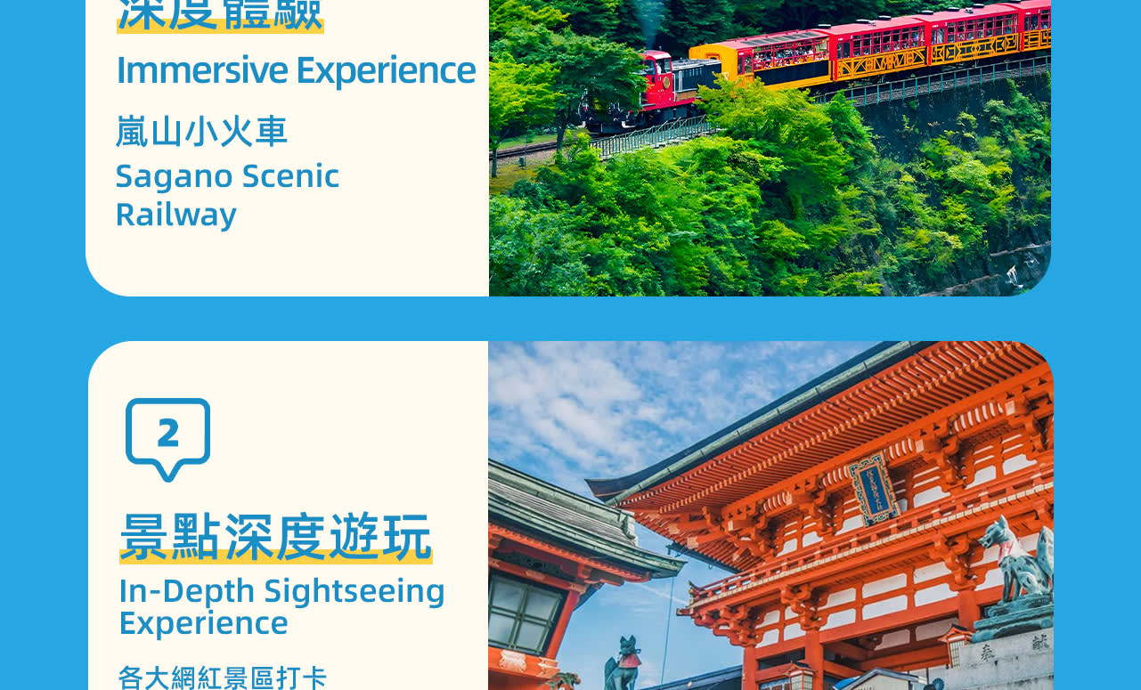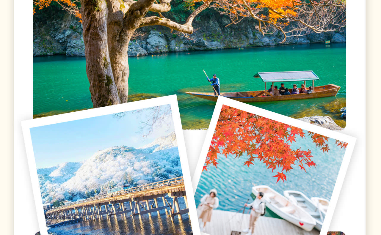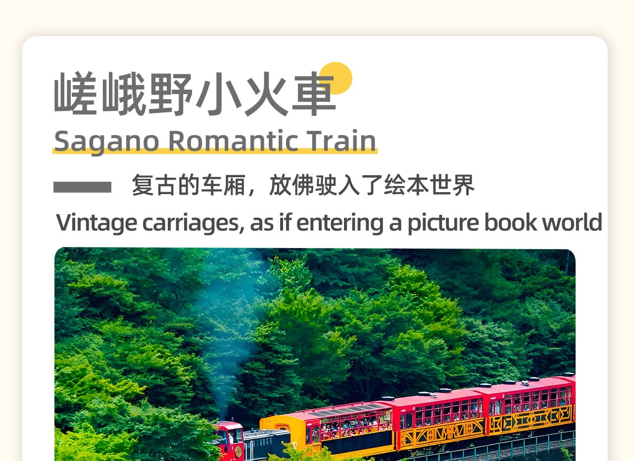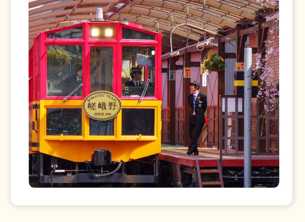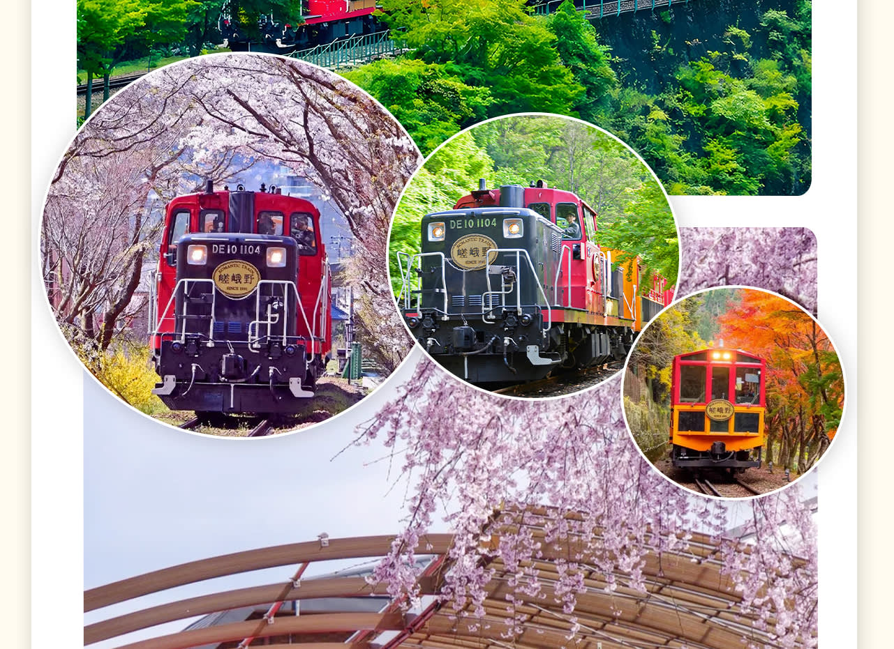 * 👣 사가노 로맨틱 열차를 타고 아라시야마를 누비며 사계절의 아름다운 절경을 감상하고, 특별한 자연을 만끽하세요.