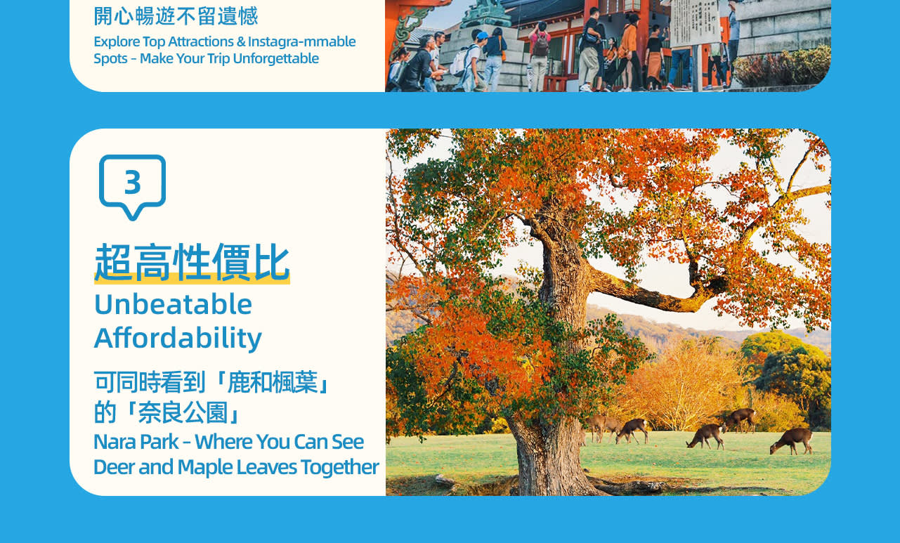 ▶미팅장소에서 출발 - 이용요건 * 만 0-2세는 별도의 좌석이 필요하지 않은 경우 무료입니다. * 만 0-17세는 반드시 티켓을 소지한 성인을 동반해야 합니다. * 만 3세 이상은 성인과 동일한 요금이 적용됩니다. - 추가정보 * 단체 고객님께는 나라 공원에서 사슴 과자를 증정합니다. 4인 가족 여행 시 사슴 과자 2봉지를 받으실 수 있으며, 3인 이하인 경우 1봉지를 받으실 수 있습니다. - 규정 및 제한사항 * 액티비티 참여 불가능: 고혈압 / 간질 / 심장 질환 / 천식 / 기타 중증 질환 / 임신부 / 장애인 * 음주 상태의 참여자는 서비스 이용이 거부될 수 있습니다. 이 경우 환불은 불가합니다. - 차량 & 수하물 정보 * 예약된 차량에 수용할 수 있는 규모보다 탑승객 인원수 또는 수하물 개수가 초과되는 경우, 운전기사는 예약을 거부할 권리가 있습니다. 이 경우 환불은 불가합니다.