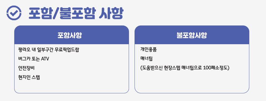 ✅ 예약안내 1. 결제 및 예약 완료 2. 스타인월드에서 개별 메시지 발송 3. 메시지에서 안내 받은 신청서를 통해 상세 투어 내용 전달 4. 상세 투어 일정 확정 및 안내 5. 스타인월드 직영으로 바우처가 필요 없으며 확정한 일정에 맞춰서 행사 진행 (투어 전날 현지 투어 안내문 발송함) 본 상품은 예약이 진행되는 상품이며 최종 확정 안내는 채널톡 연결 후 개별 안내드립니다 연결이 안될시 예약상품은 취소될 수 있습니다 채널톡 : 스타인월드_세부 [한국 스타인월드 근무시간] * 취소 접수 기준 : 영업일 기준 평일 오전 10:00 ~18:00(주말&공휴일 제외) * 운영시간 이후 접수 건은 다음 영업일 기준으로 적용됩니다. - 개별 여행자 보험에 가입을 권장드립니다. - 본 상품은 고객 결제 후 해피콜/해피톡 때 여행 출발에 대한 최종 확정 여부를 결정하며,출발 확정 이후 취소 시, 귀책사유에 따라 약관에 따릅니다. 구매 전, 약관 내용을 반드시 숙지하셔서 신중한 구매 부탁드립니다. - 최소 출발인원 미 충족 시 여행표준약관 제9조에 따라 여행사는 여행출발 2일 전까지 여행계약을 일방적으로 해제하고 소비자에게 통보할 수 있습니다. 여행 참가자 수의 미달로 여행개시 2일전까지 여행계약 해지 통보 시 여행신청금은 전액 환급 또는 날짜변경으로 안내드립니다.