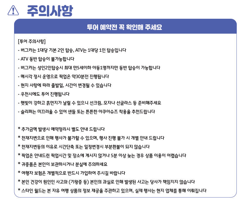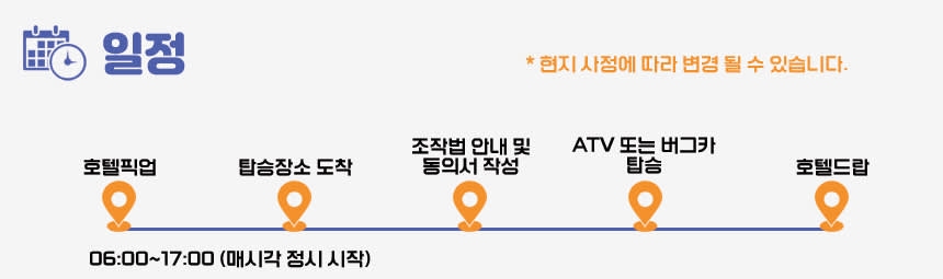 06:00 ~ 17:00 매시각 정시시작 햇빛이 강하고 흙먼지가 날릴 수 있으니 선크림, 모자나 선글라스 등 준비해주세요 슬리퍼는 미끄러울 수 있어 샌딩 또는튼튼한 아쿠아슈즈 착용을 추천드립니다