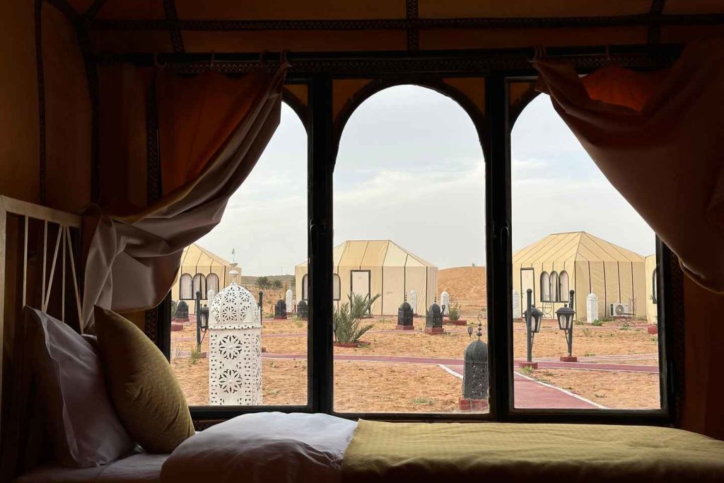 둘째 날에는 극적인 협곡 벽과 야자수 오아시스로 유명한 토드라 협곡을 지나 사하라 사막으로 계속 이동합니다. 오후에는 메르주가에 도착하여 황금빛 사구를 가로지르는 낙타 트레킹을 즐기세요. 사막 캠프에 도착하여 저녁 식사를 즐기고, 현지 음악을 감상하며, 별빛 아래에서 하룻밤을 보냅니다.