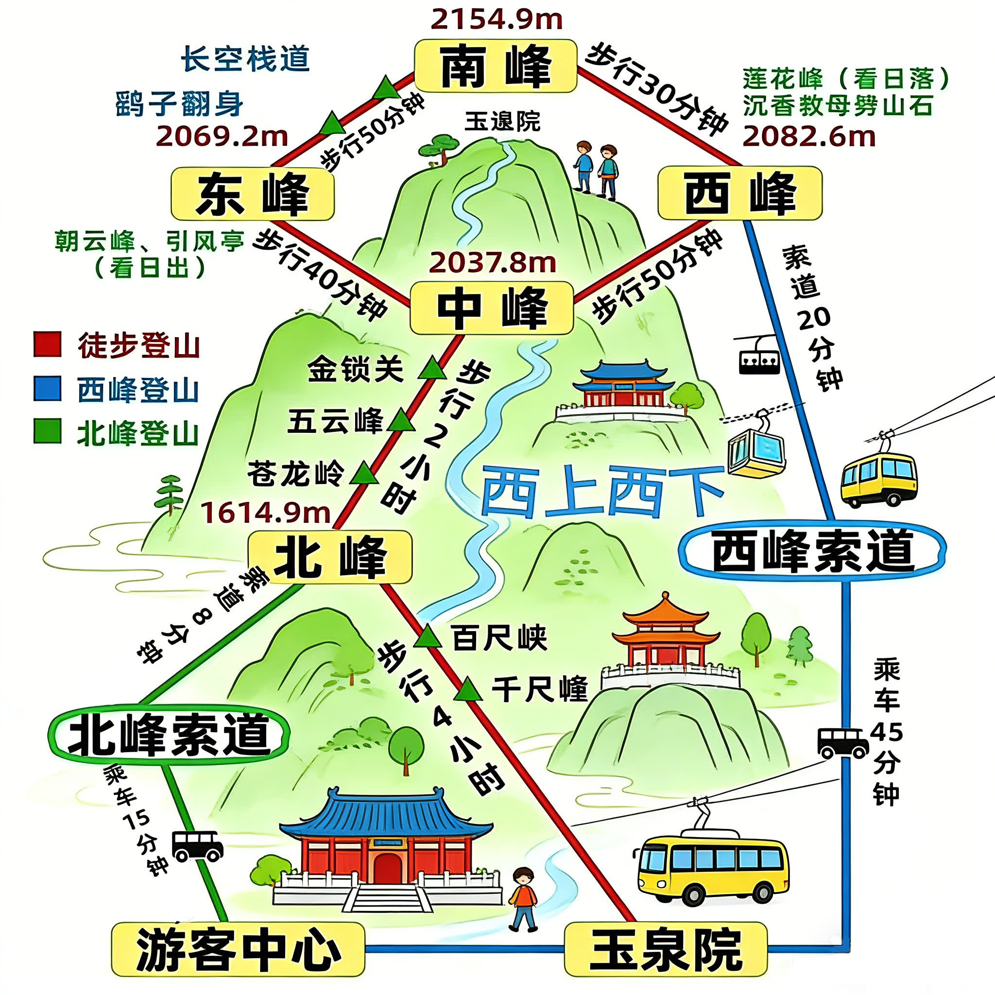 1. 완벽한 경치 감상형: 서봉 출발, 북봉 하산 여행 경로: 여행자 센터 -- 셔틀버스를 타고 서봉 케이블카 탑승장으로 이동 -- 케이블카를 타고 산 정상으로 이동 -- 서봉 -- 남봉 -- 동봉 -- 중봉 -- 북봉 -- 북봉 케이블카를 타고 하산 -- 셔틀버스를 타고 여행자 센터로 이동 핵심 포인트: 되돌아가는 길 없이 화산의 전경을 일주하는 코스 난이도: 별 4개