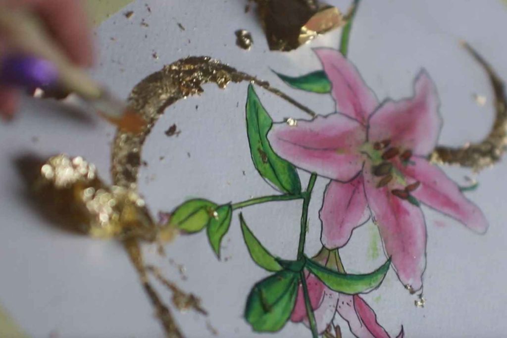 연필로 그림을 그린 후, 다양한 수채화 기법을 사용해 기본 색조를 더해 세부 묘사를 살립니다. 그런 다음 접착제를 바른 금박을 조심스럽게 붙이고 말립니다.