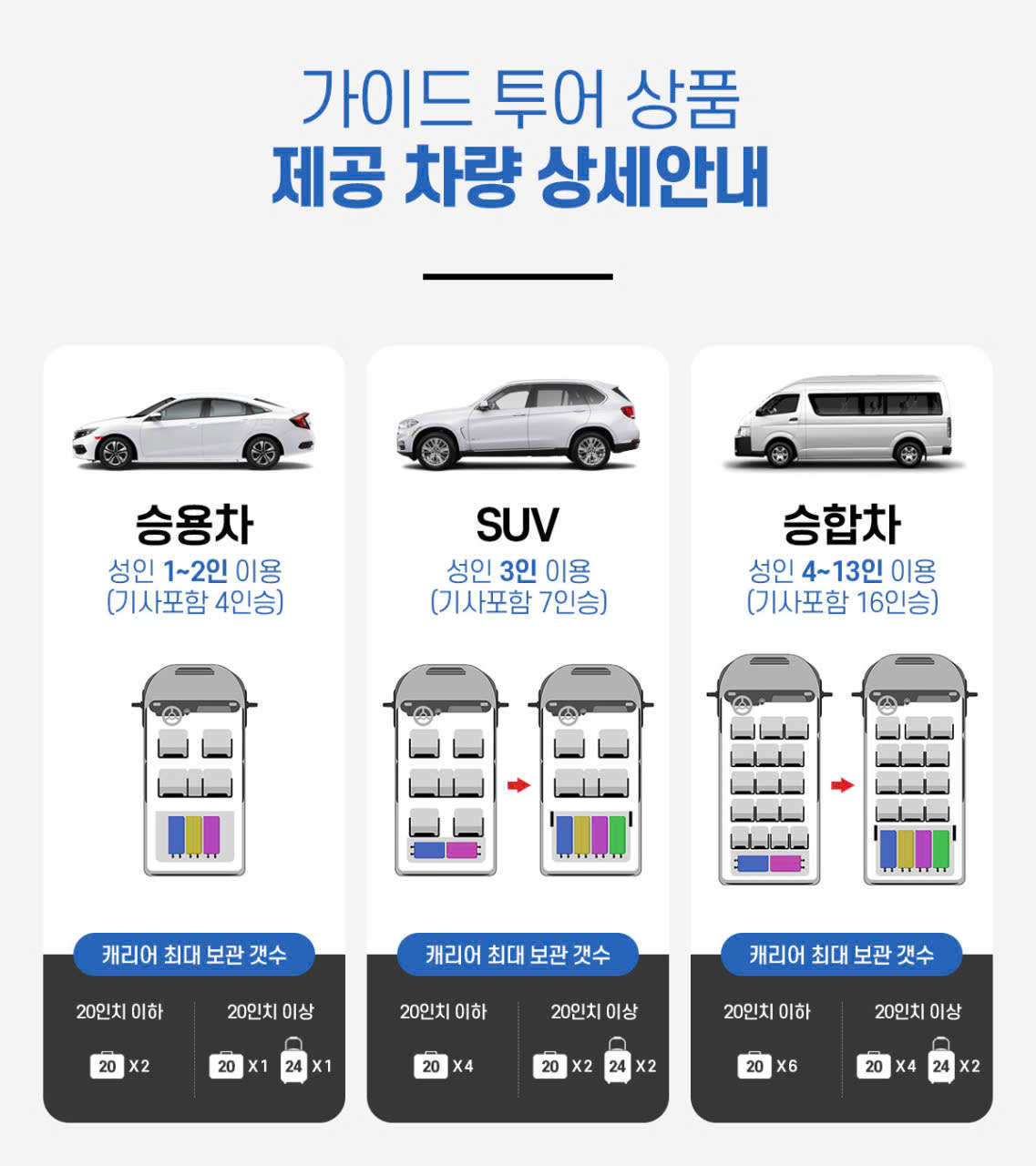 * 예약인원별 차량제공안내, 성인 1-2인 승용차 / 3인은 SUV 차량 제공 / 성인 4-10인은 승합차 제공