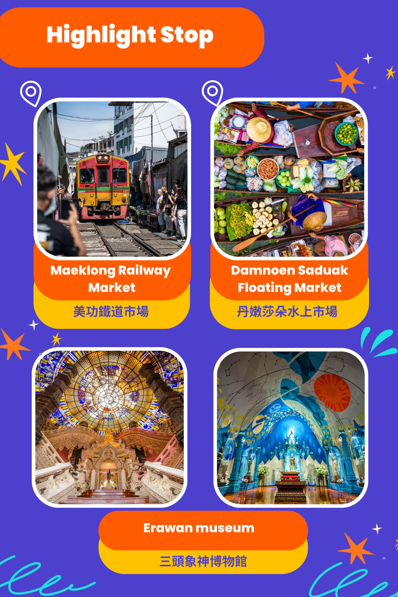 활기 넘치는 담넌 사두억 수상시장과 경이로운 에라완 박물관을 탐험하는 매혹적인 일일 투어에 참여하세요. 기차가 지나갈 때 상인들과 배들이 상품을 판매하는 매끌롱 기찻길 시장의 매혹적인 광경을 목격하세요. 그런 다음 에라완 박물관의 풍부한 유산에 흠뻑 빠져 숨 막힐 듯한 건축물과 방대한 종교 유물 컬렉션에 감탄해보세요. 이 종합 투어는 태국의 문화적 보물과 번화한 시장을 잊을 수 없는 탐험을 약속합니다.