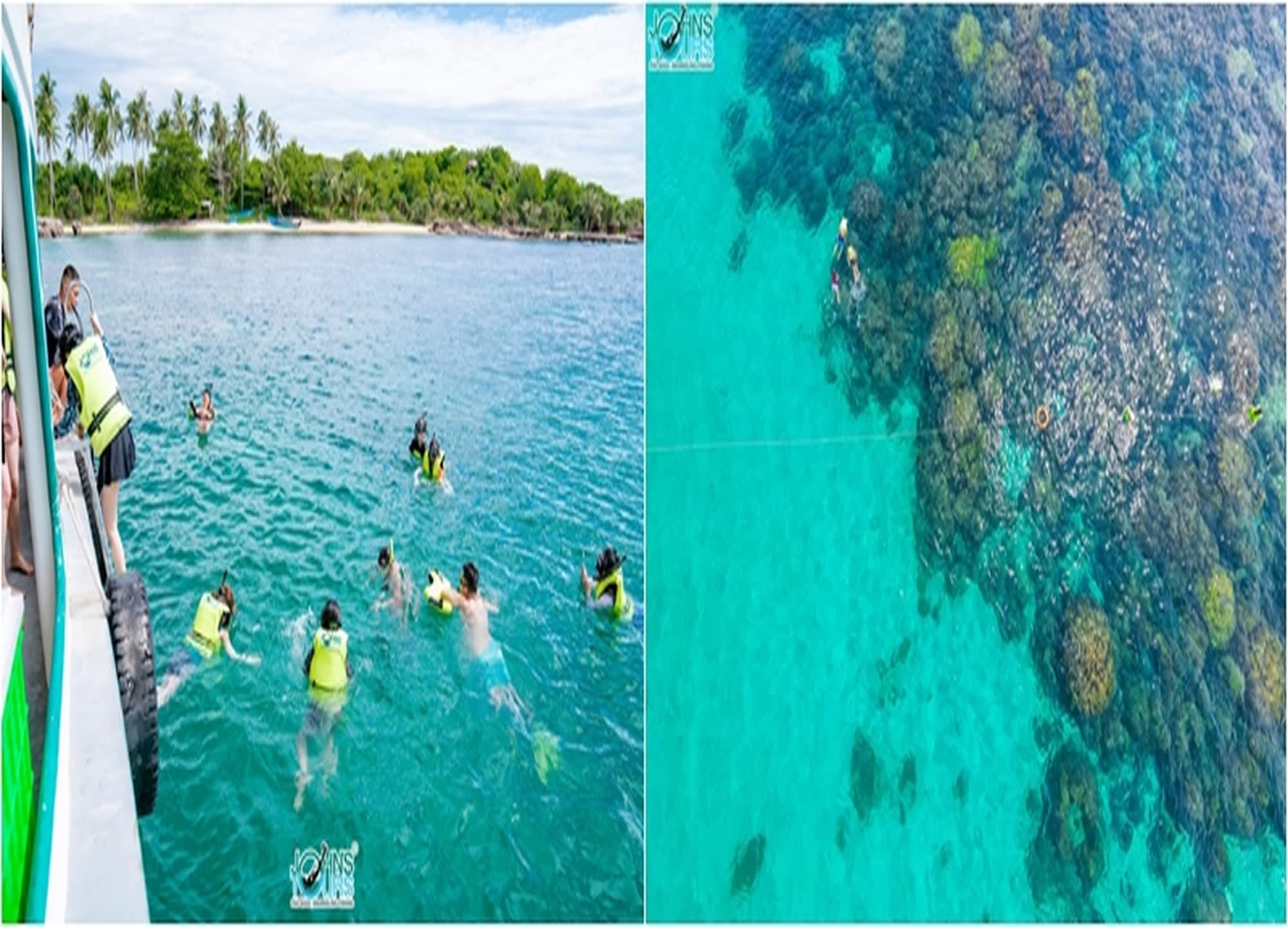 ▶ 주의사항 - 📢 호핑투어 주의사항 및 준비물안내 해양 스포츠 이용시 안전상의 문제가 있으므로 주의가 필요하며, 사고시 별도의 보험은 가입되어 있지 않습니다. - 물놀이에 필요한 수건, 수영복, 썬크림, 비치타월 등 개인준비 - 배에서 옷을 갈아입기 불편합니다. 미리 호핑투어에 필요한복장(수영복등)으로 준비해서 호텔에서 출발해주세요. - 스노쿨링 장비: 성인용만 준비 되어있습니다.(아동 장비없음, 개별준비) ※ 조인 투어로 모집 인원 미달 시 투어가 취소될 수 있으며, 이 경우 사전에 연락 드리며 환불처리 해드립니다. - 💰 푸꾸옥 시내 지역 외 차량추가요금 (왕복) - 푸꾸옥 시내 지역 외 차량추가요금 (왕복) → 가이드분에게 직접 지불해주세요. → 픽업시간은 예약확정서에 기재해드립니다. (1) Ông Lang- Gành Gió Area - 코코팜, 커티지, 카미아, 푸꾸옥 에고 비치 등 1-2인 : 100,000동/1인, 3-4인 : 70,000동/1인, 5-7인 : 50,000동/1인, 8-10인 : 20,000동/1인, 11인 이상 : 무료 (2) Cửa Cạn Area - 모벤픽, 에코롯지, 투이반 등 1-2인 : 150,000동/1인, 3-4인 : 100,000동/1인, 5-7인 : 50,000동/1인, 8-10인 : 30,000동/1인, 11인 이상 : 무료 (3) Vũng Bầu / Vinpearl/ Bãi Thơm/Gành Dầu/ Hàm Ninh Area 1-2인 : 200,000동/1인, 3-4인 : 150,000동/1인, 5-7인 : 100,000동/1인, 8-10인 : 50,000동/1인, 11인 이상 : 무료 (4) An thoi 1-2인 : 200,000동/1인, 3-4인 : 150,000동/1인, 5-7인 : 100,000동/1인, 8-10인 : 50,000동/1인, 11인 이상 : 무료[구글지도 호텔명 검색](https://www.google.com/maps/d/u/0/viewer?mid=1eo6ydh__XZfGIRVDy8aM1zyF21844FU&ll=10.206199256828134%2C103.93181765000004&z=11) - 💸 팁안내 의무팁은 없으며 투어에 만족하셨을경우 매너팁은 허용합니다. 차량기사/가이드 매너팁 : 1팀당 5만동 ~ 10만동 - 🧳짐보관 선착장 가는길에 존스투어 사무실을 경유시 해당 사무실에 보관하며, 사무실 경우가 불가할 경우 버스에 보관가능합니다. - 보관 가능 수량이 한정되어있어서 꼭 사전요청을 해주세요. 미요청시 보관이 불가합니다. - 📢 변경 및 기타안내 우천 시에도 진행됩니다. 운영사 측에서 사전에 운영을 중단하는 경우에만 따로 연락드립니다. 변경 내용은 투어 진행 날짜 3일 전까지 채널로 연락 주세요. 긴급 연락은 이메일로 발송된 바우처에 기재된 비상 폰으로 연락 주세요.[카카오채널 ](http://pf.kakao.com/_wsszxl)