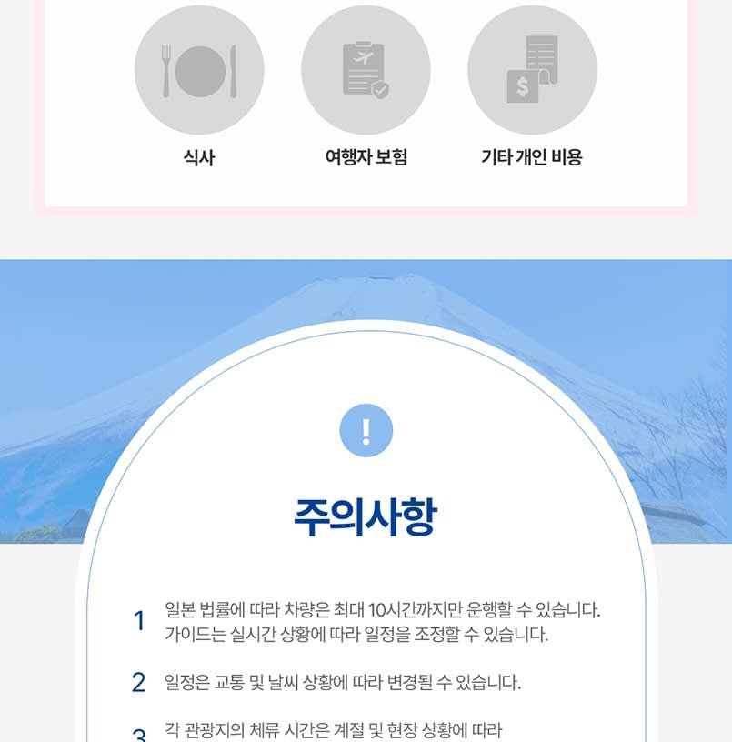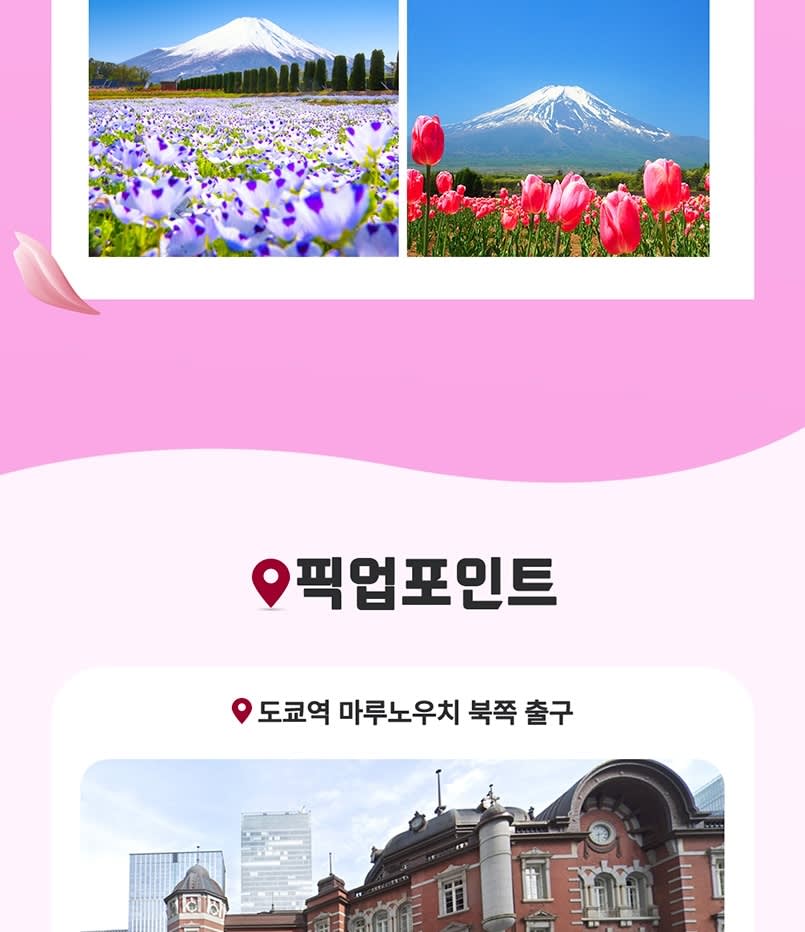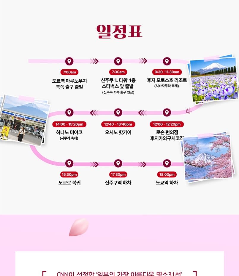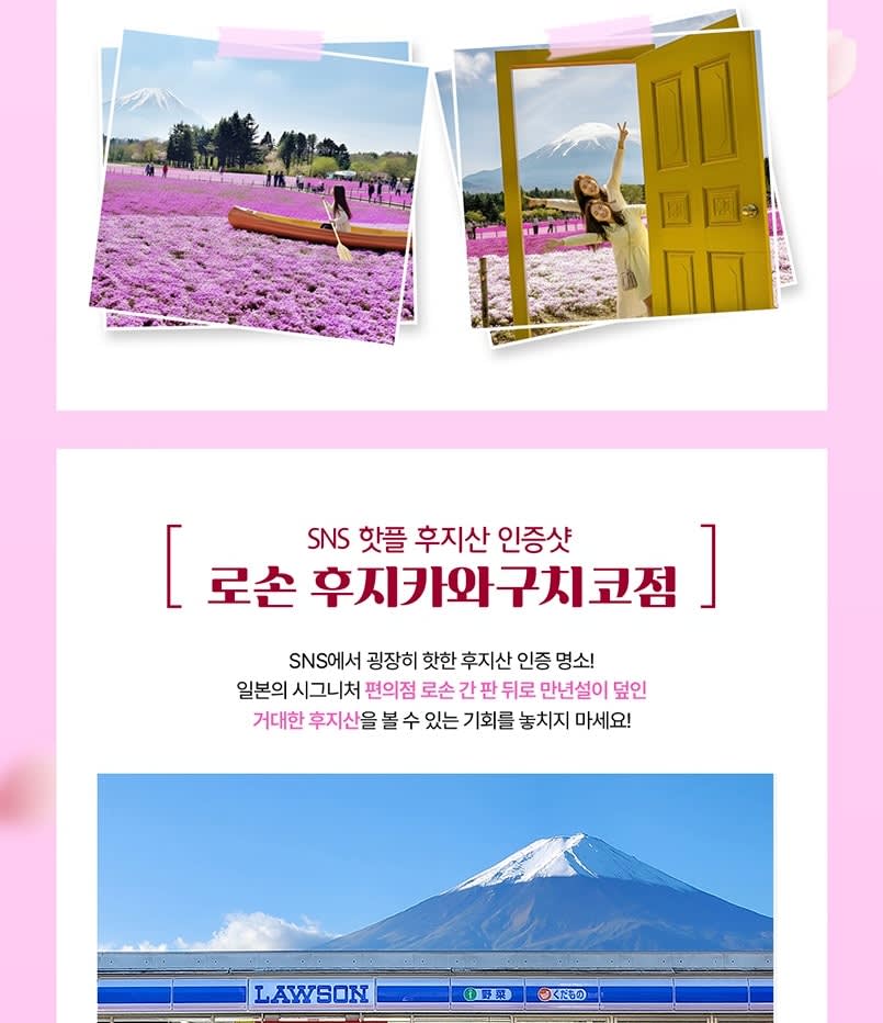 ▶후지 모토스코 리조트 + 포토 스팟 '로손' + 오시노 핫카이 + 하나노 미야코 - 이용요건 * 본 상품은 이용 가능 연령이 제한되어 있지 않습니다. * 만 0-2세는 별도의 좌석이 필요하지 않은 경우 무료입니다. * 그룹 규모: 참여자 수 1-49인 - 추가정보 * 📢 점심 시간이 포함되어 있지 않으므로, 관광지나 버스에서 즐길 수 있는 간식이나 가벼운 점심을 가져오시는 것을 권장합니다. * 출발 하루 전 오후 3시에서 5시 사이에 알림 이메일을 보내드립니다. 이 이메일에는 투어 직원과 직접 소통할 수 있는 그룹 채팅 링크가 포함되어 있습니다. 이메일을 찾을 수 없는 경우 스팸 또는 정크 메일함을 확인해 주세요. * 출발 시간 10분 전까지 출발 지점에서 기다려 주시기 바랍니다. 탑승 시간에 늦으시면 환불받으실 수 없습니다. * 수하물이나 유모차 반입과 관련하여 투어 당일 버스 크기에 따라 달라지므로 고객 서비스팀에 문의해 주십시오. 투어 날짜 하루 전 한국 시간 오전 10시 이후에 연락 주시는 것을 권장합니다. * 여행자 보험이 필요하신 경우 개별적으로 준비해 주시기 바랍니다. 단, 여행 일정 중 이용하는 각 교통수단은 손해 보험에 가입되어 있습니다. * 차량은 투어 당일 인원수에 따라 배정되며, 개인적으로 이용할 수 없습니다. * 일정은 교통 및 기상 상황에 따라 달라질 수 있습니다. * 각 장소의 체류 시간은 계절 및 현장 상황에 따라 달라질 수 있습니다. * 일본 법률에 따라 차량은 10시간 이상 운행할 수 없습니다. 투어 가이드는 실시간 상황에 따라 일정을 조정할 수 있습니다. - 편의성/접근성 * 유모차 이용이 가능합니다. * 휠체어 이용이 불가합니다. - 차량 & 수하물 정보 * 탑승 가능 인원수: 49인 (운전기사 제외)
