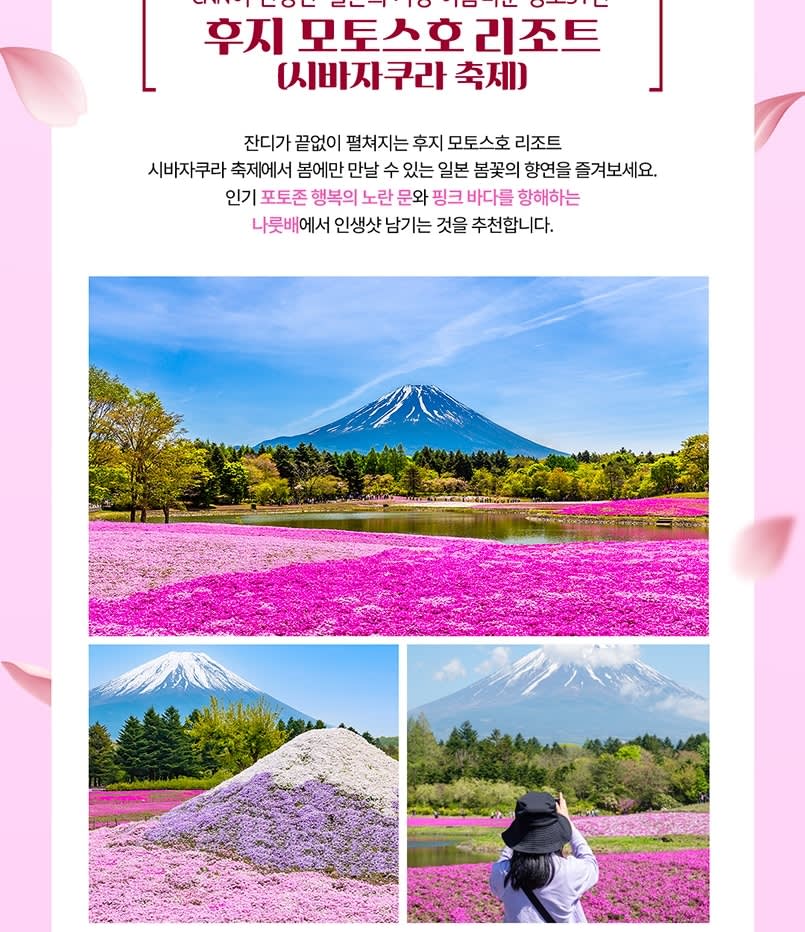 후지 시바자쿠라 축제 (핑크 모스 플록스)핑크빛 세상으로 들어오세요! 시바자쿠라 축제는 일본에서 가장 인기 있는 봄 행사 중 하나입니다. 웅장한 후지산 기슭에 50만 송이의 선명한 분홍색, 흰색, 보라색 꽃이 카펫처럼 펼쳐진 모습을 상상해 보세요. 잊을 수 없는 사진을 보장하는 일년에 한 번뿐인 장관입니다.