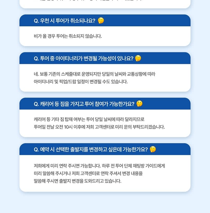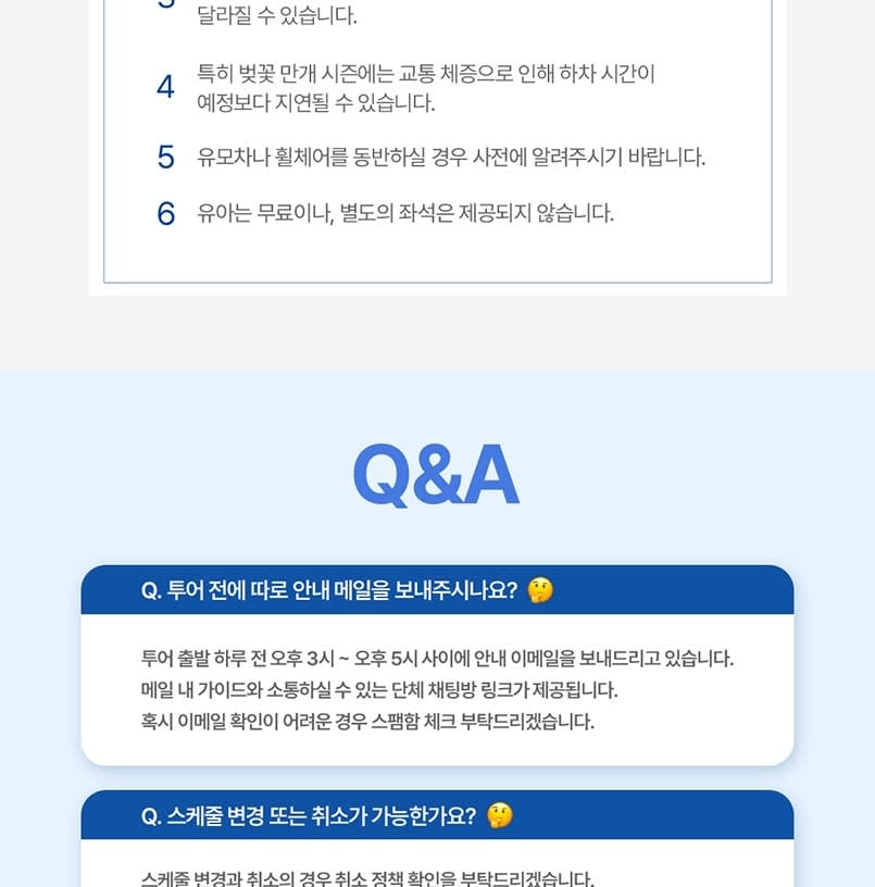 * Q1) 투어 전에 알림이나 리마인더를 받을 수 있나요? 출발 하루 전 오후 3시부터 5시 사이에 리마인더 이메일을 보내드립니다. 이 이메일에는 투어 직원과 직접 소통할 수 있는 그룹 채팅 링크가 포함되어 있습니다. 이메일을 찾을 수 없는 경우 스팸 또는 정크 메일함을 확인해 주세요. * Q2) 투어 날짜를 변경/취소하고 싶습니다. 가능한가요? 일정 변경 또는 취소에 관해서는 취소 정책을 참조해 주세요. * Q3) 내일 비가 온다고 들었습니다. 투어가 취소되나요? 비가 오는 날씨로 인해 투어가 취소되지는 않습니다. * Q4) 투어 중 일정이 변경될 가능성이 있나요? 네. 일정 및 픽업/드롭오프 시간은 현장 교통 및 날씨 상황에 따라 달라질 수 있습니다. * Q5) 수하물 가방을 가져갈 수 있나요? 수하물 반입에 관해서는 투어 당일 버스 크기에 따라 달라지므로 고객 서비스팀에 문의해 주세요. 투어 하루 전 한국 시간 오전 10시 이후에 문의하시는 것을 권장합니다. * Q6) 미팅 장소를 변경하고 싶습니다. 어떻게 해야 하나요? 투어 버스를 만나고 싶은 장소를 투어 가이드에게 알려주세요. 또는 투어스토리에 연락하여 미팅 장소 변경을 요청할 수 있습니다.