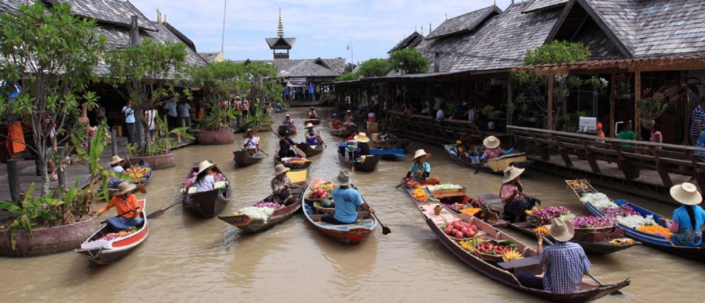 파타야 수상 시장에서 4개 지역에서 온 태국인들을 구분하는 방법을 확인합니다