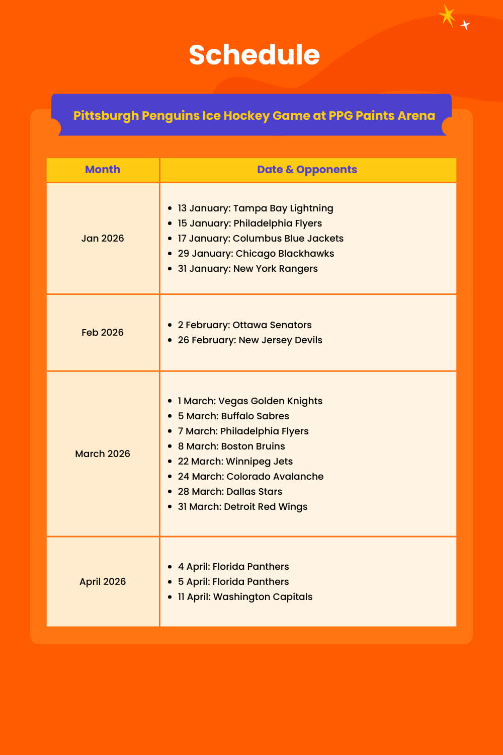 NHL에서 가장 활기 넘치는 경기장 중 하나인 PPG 페인츠 아레나에서 피츠버그 펭귄스 아이스하키 경기의 흥분을 경험해 보세요. 펭귄스가 빙판 위에서 기술, 속도, 강렬한 액션을 빠르게 선보일 때 열정적인 팬들과 함께하세요. 정확한 패스와 강력한 슛부터 극적인 세이브와 열광적인 골 세리머니까지, 모든 순간이 순수한 아드레날린을 선사합니다. 이 경기장은 훌륭한 시야, 현대적인 편의 시설, 그리고 처음 방문하는 사람들과 평생 팬들이 편안함을 느끼게 하는 짜릿한 분위기를 제공합니다. 친구, 가족 또는 동료 하키 애호가들과 함께 여행하든, 펭귄스 경기는 잊을 수 없는 즐거움과 피츠버그 스포츠 문화의 진정한 맛을 약속합니다.