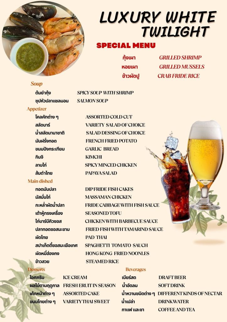▶ 주의사항 - 📢 주의 사항 수하물이나 가방 보관 불가 합니다. 출항 30분 전에는 도착하셔서 티켓을 교환해주시기 바랍니다. - 🔸안전 사항 안내 해당 크루즈 선은 구명조끼가 구비 되어 있습니다. 구비된 위치를 잘 파악하시어 긴급상황시에 안전하게 이용 해 주시기 바랍니다. - 🌧️ 우천 및 특이 사항 발생시 진행 안내 비가 많이 올 경우, 보통 천장을 닫고 진행하거나 실내석으로 안내합니다. 또는 지연 운항이 될 수도 있으니 크루즈 측 현장 안내를 받으시길 바랍니다. 운행시간, 운행경로, 식사 종류 등 크루즈 사정에 의해 임의로 변경될 수 있습니다. 비가 많이 와서 강 수위가 높아질 경우 운행경로는 안전상 이유로 변경됩니다. - 🔸 그 외 안내사항 일부 특별 기간은 크루즈측 사정으로 가격 및 서비스 내용이 예고없이 변경될 수 있어요. (성탄절, 송크란, 신년, 태국 휴일, 발렌타이데이 등 특별요금이 부과) - 🥂 메뉴 안내 메뉴는 아래를 참고해 주세요. ▶ 아동 정책 유아 만 3세 이하 무료 / 따로 좌석은 배정되지 않습니다. 만4세~10세는 아동 요금이 적용됩니다.