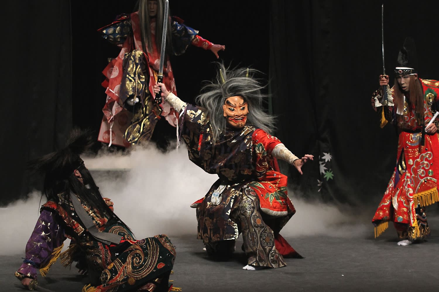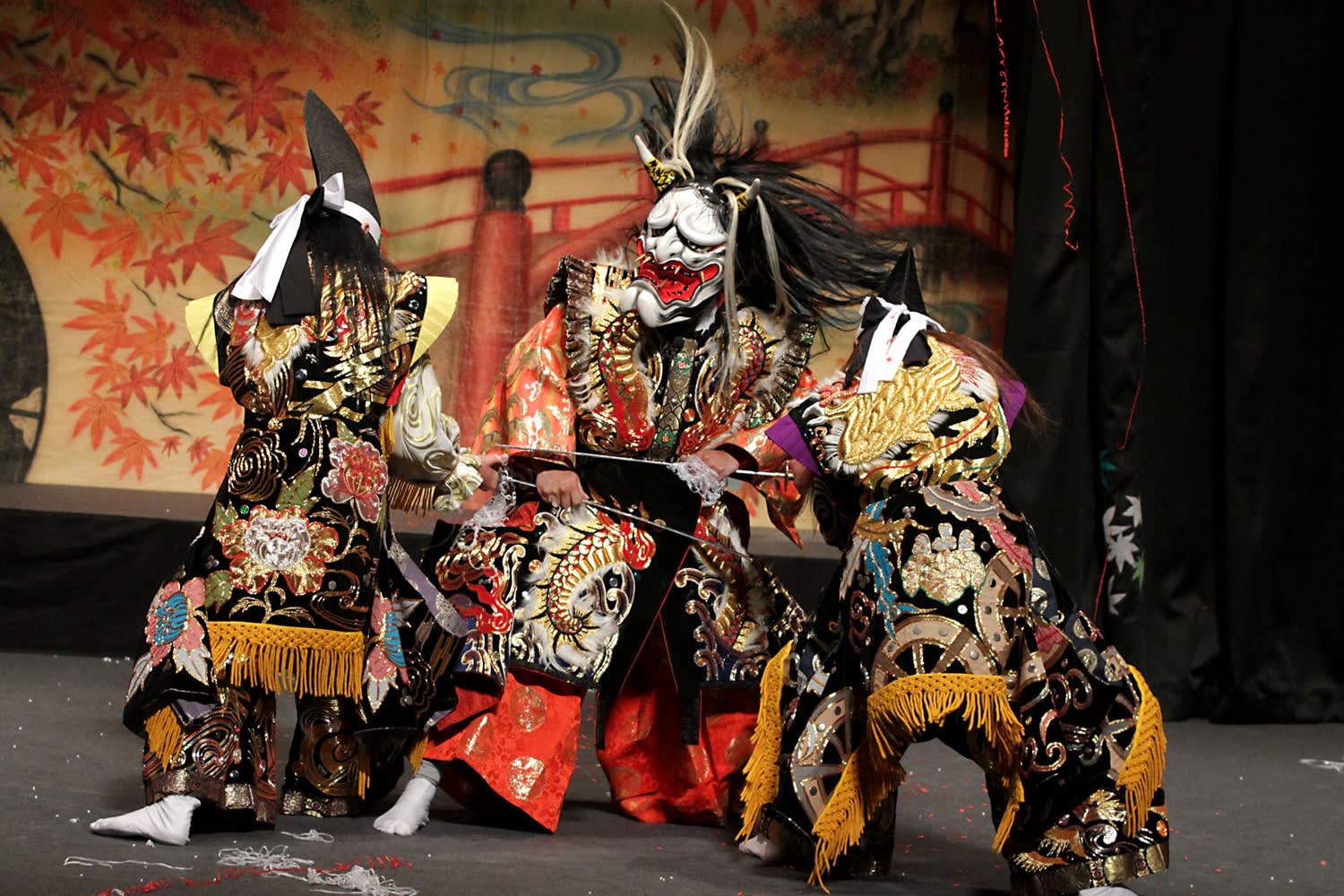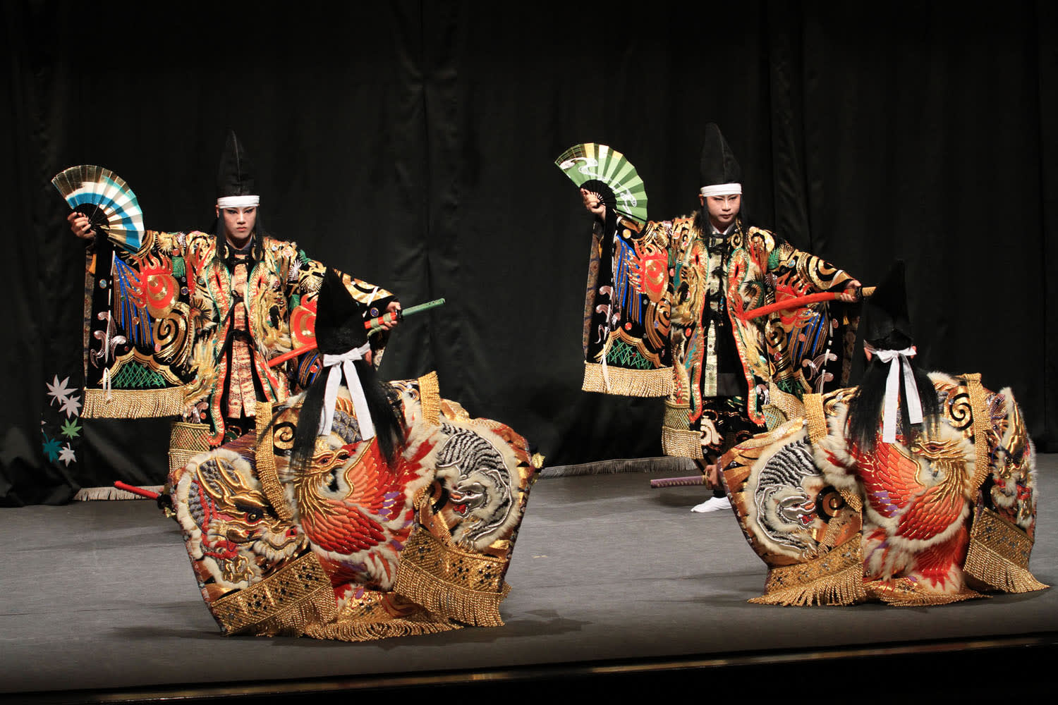 * 일본 신화나 고전 문학을 소재로 한 공연으로, 화려한 의상을 입은 연기자가 리듬감 있는 반주에 맞춰 화려한 춤을 선보입니다.