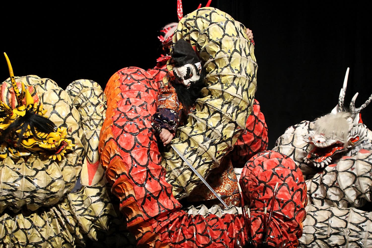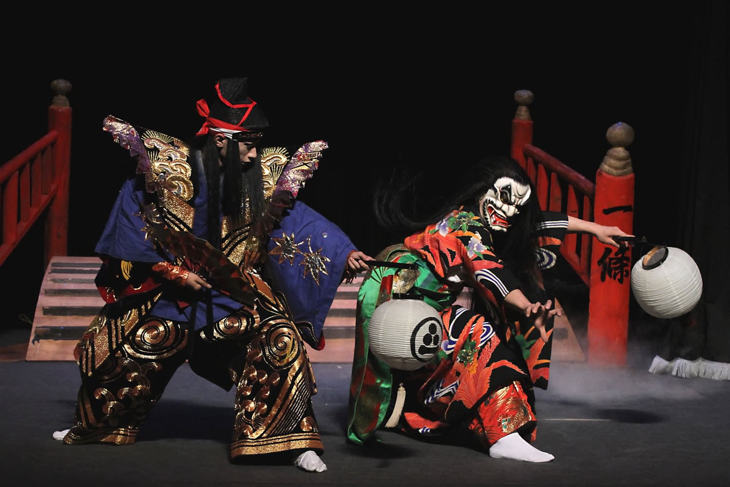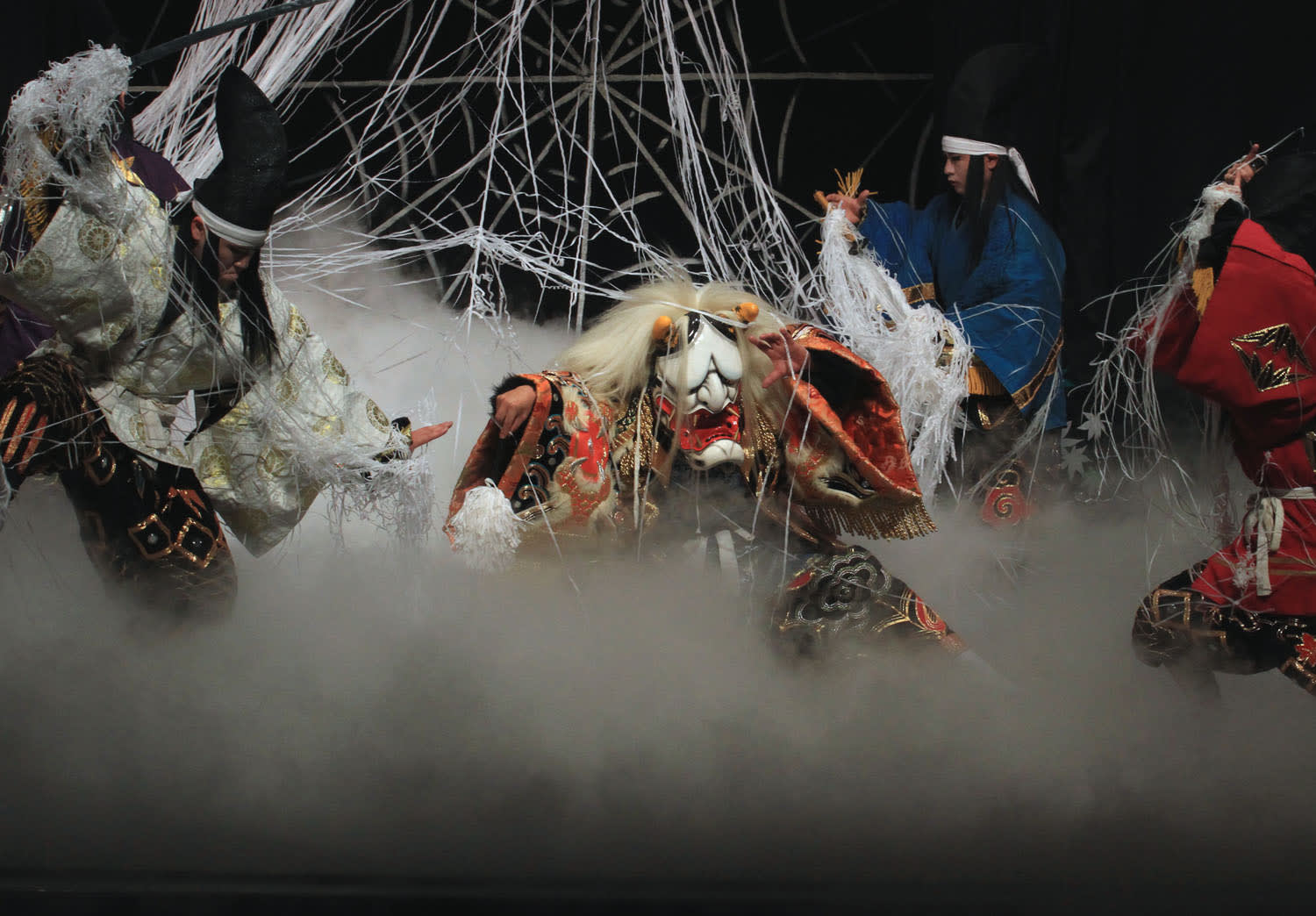* 일본 신화나 고전 문학을 소재로 한 공연으로, 화려한 의상을 입은 연기자가 리듬감 있는 반주에 맞춰 화려한 춤을 선보입니다.