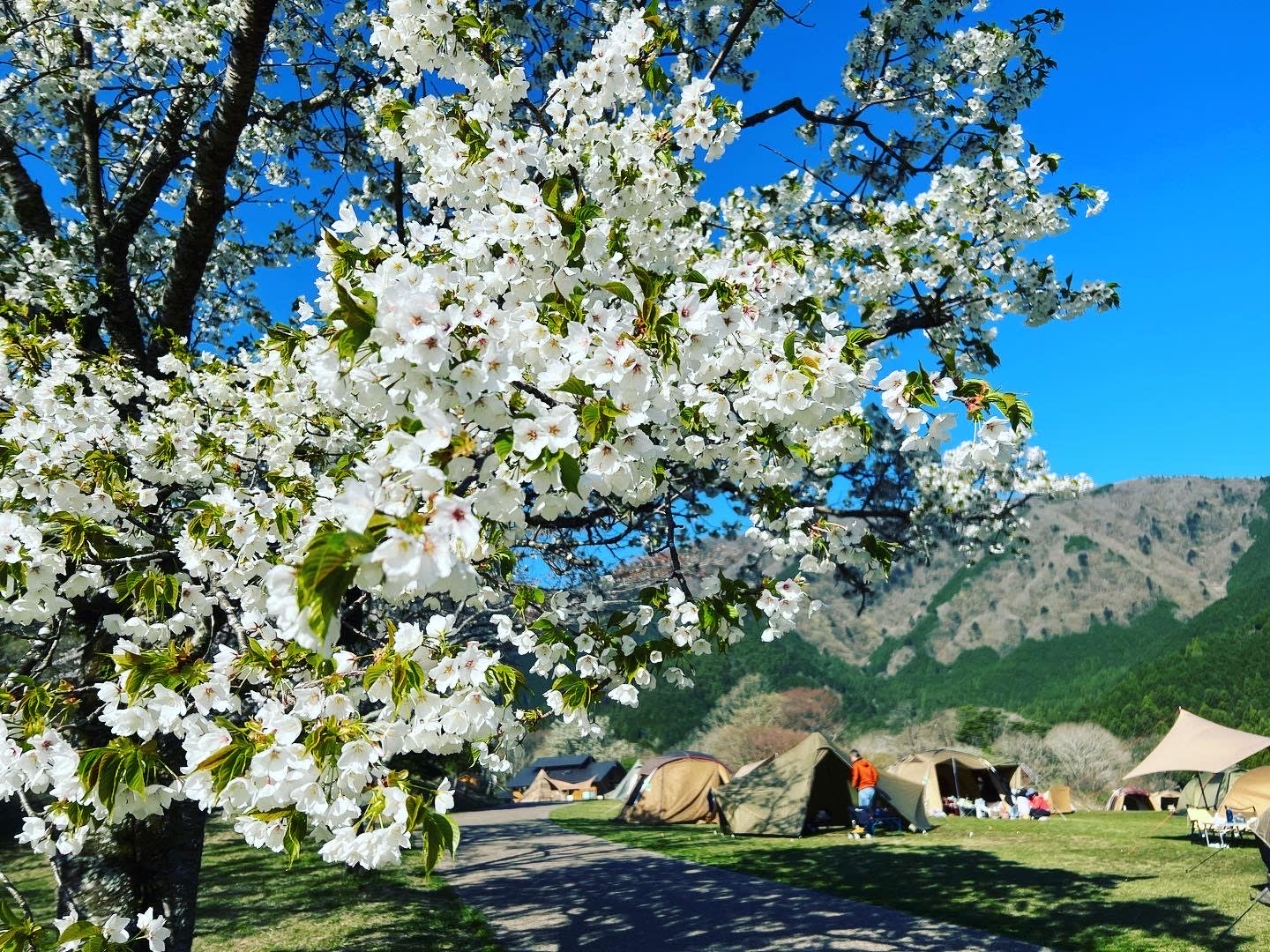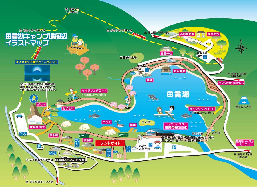 * 봄에는 호반을 따라 약 350그루의 왕벚나무와 산벚나무가 만개하며, 초여름에는 남쪽 텐트 사이트 주변에서 반딧불이를 볼 수 있습니다.