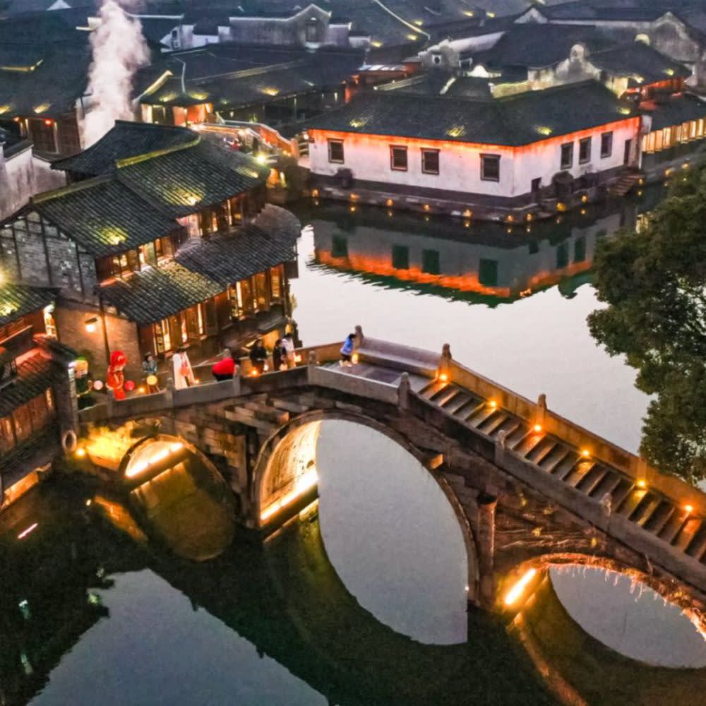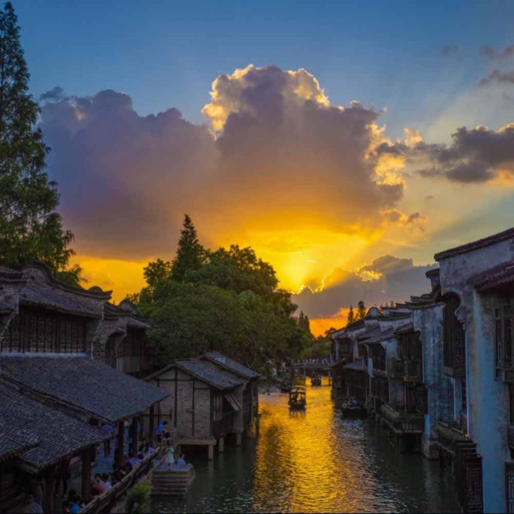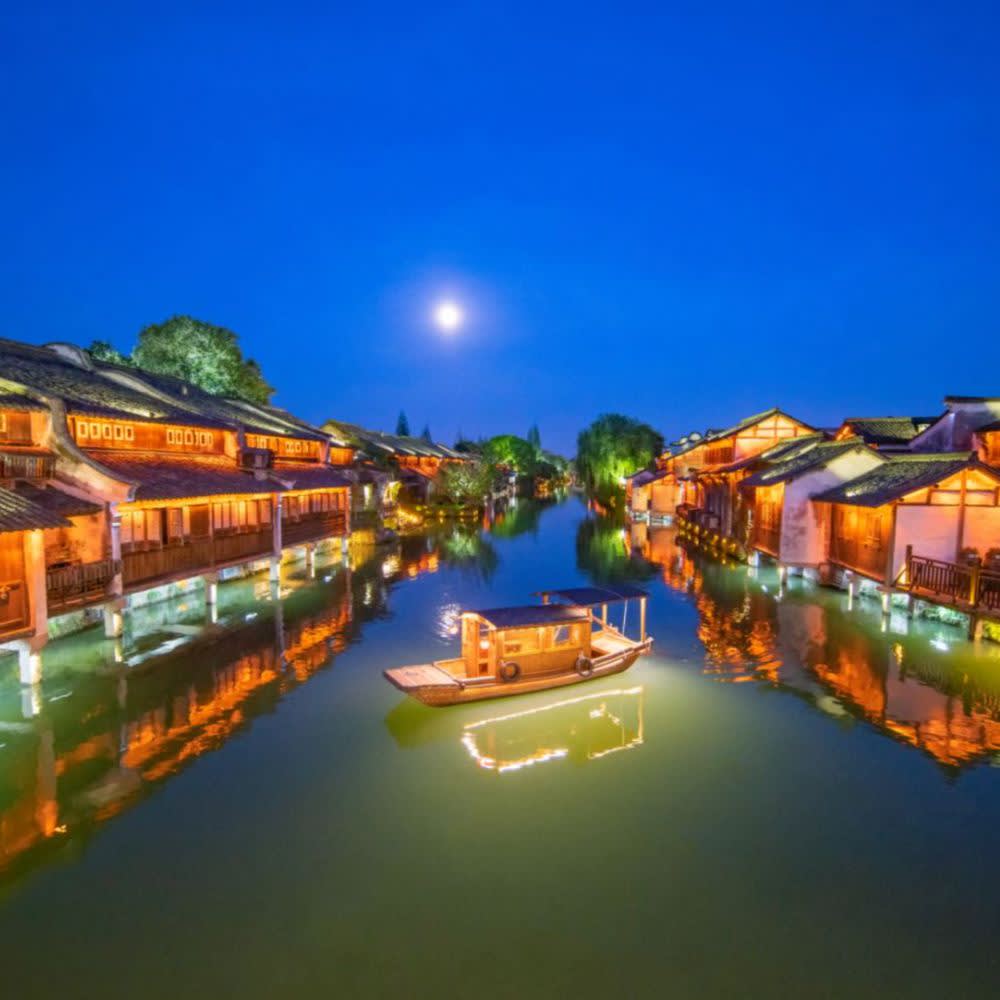 ์ฐ์ (Wuzhen): ์ ์ฅ์ฑ์ ์ํฅ๋ง์๋ก ์๋ ค์ง ์ง์ญ. ๋ฌผ๊ธธ์ ๋ฐ๋ผ ๊ณ ๊ฑด์ถ, ์์ , ๊ฐค๋ฌ๋ฆฌ, ์ฐป์ง์ด ๋ชจ์ฌ ์์ด ์ฐ์ฑ